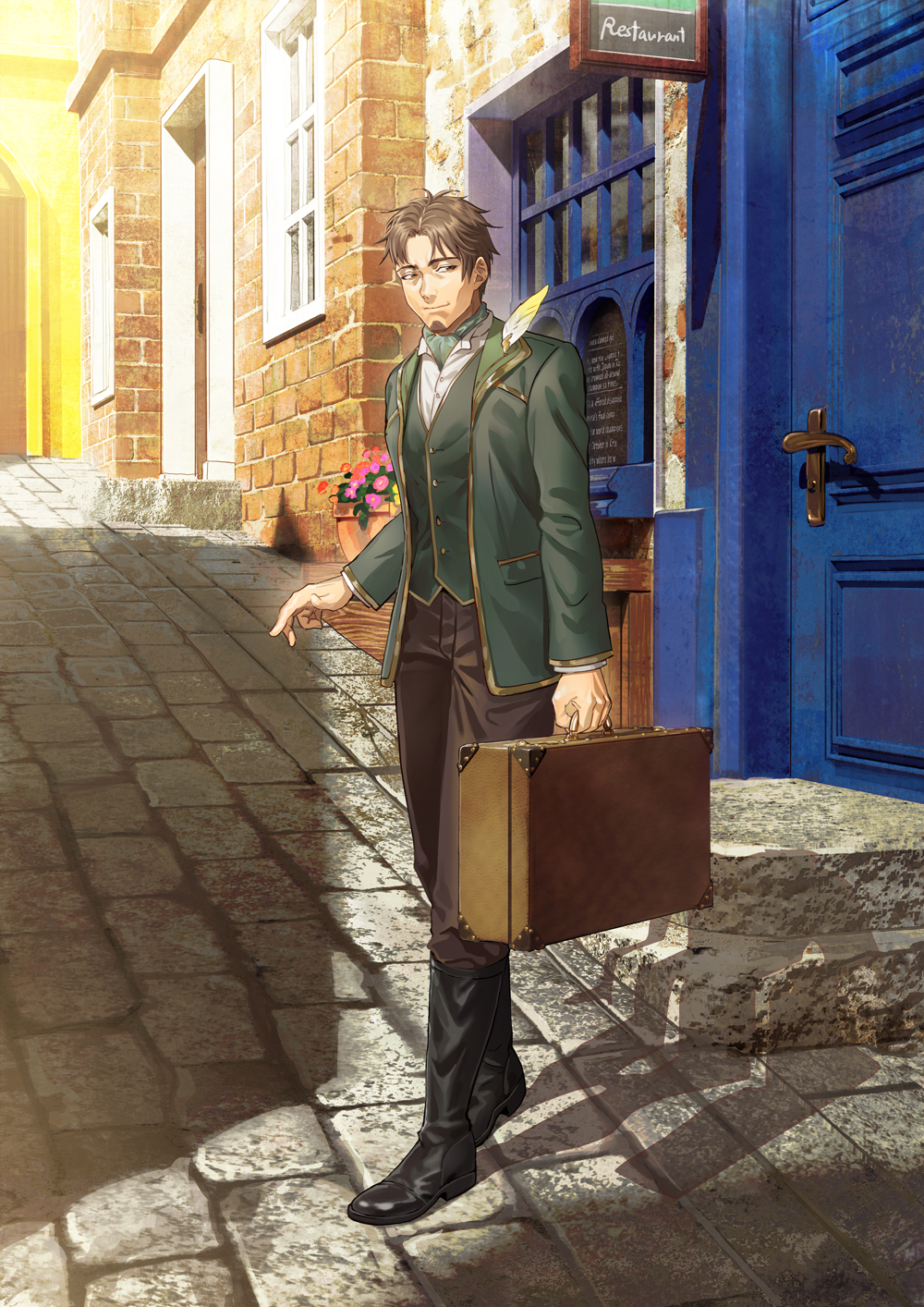 1boy beard black_footwear brown_eyes brown_hair facial_hair feathers gold_trim green_vest highres long_sleeves male_focus outdoors panmijin99 pants pixiv_fantasia pixiv_fantasia_scepter_of_zeraldia shadow sign standing suitcase vest