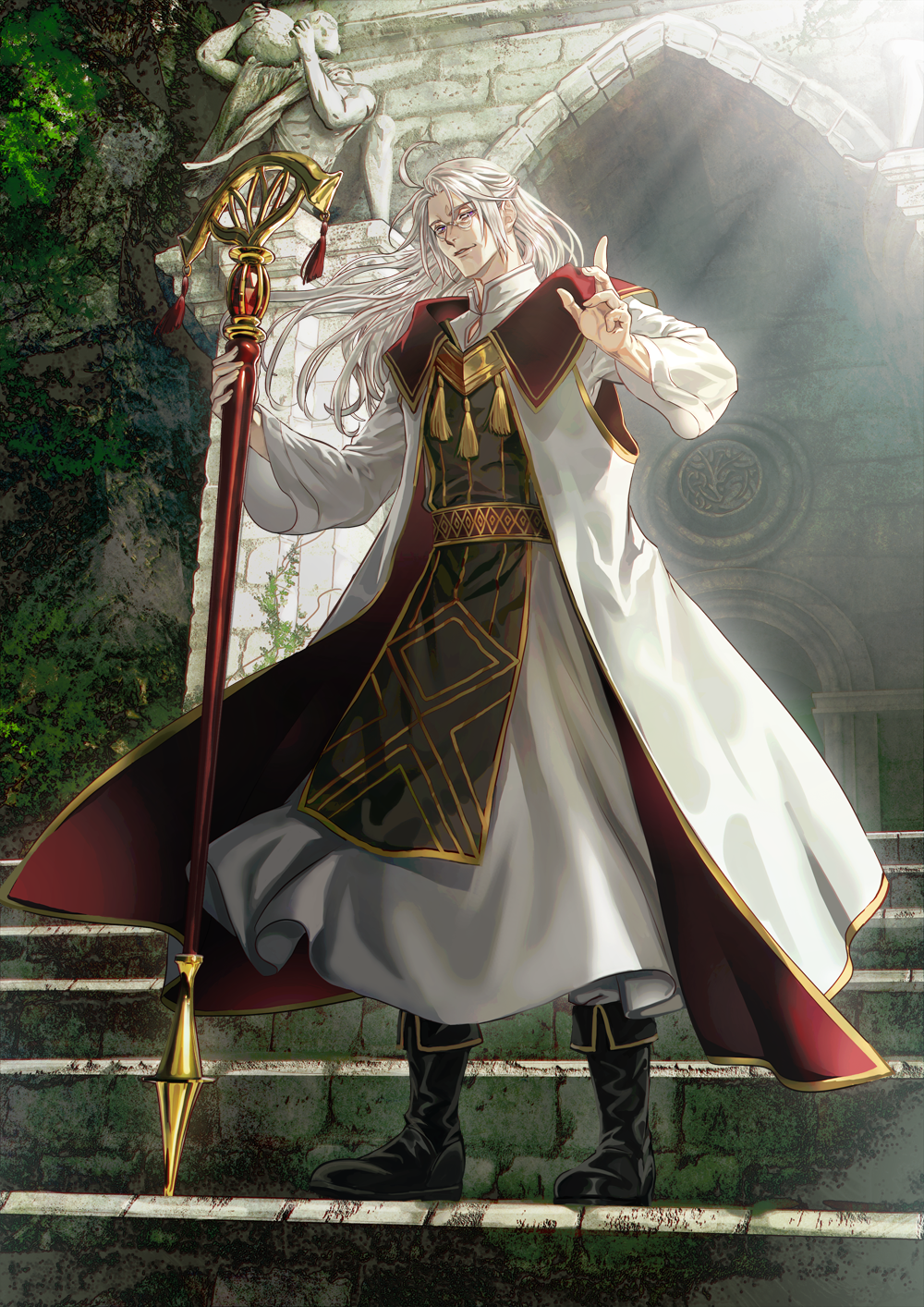 1boy black_footwear full_body glasses gold_trim highres holding holding_staff juju_leelin long_hair looking_at_viewer male_focus outdoors panmijin99 pixiv_fantasia pixiv_fantasia_scepter_of_zeraldia robe solo staff stairs standing statue tassel white_hair wide_sleeves