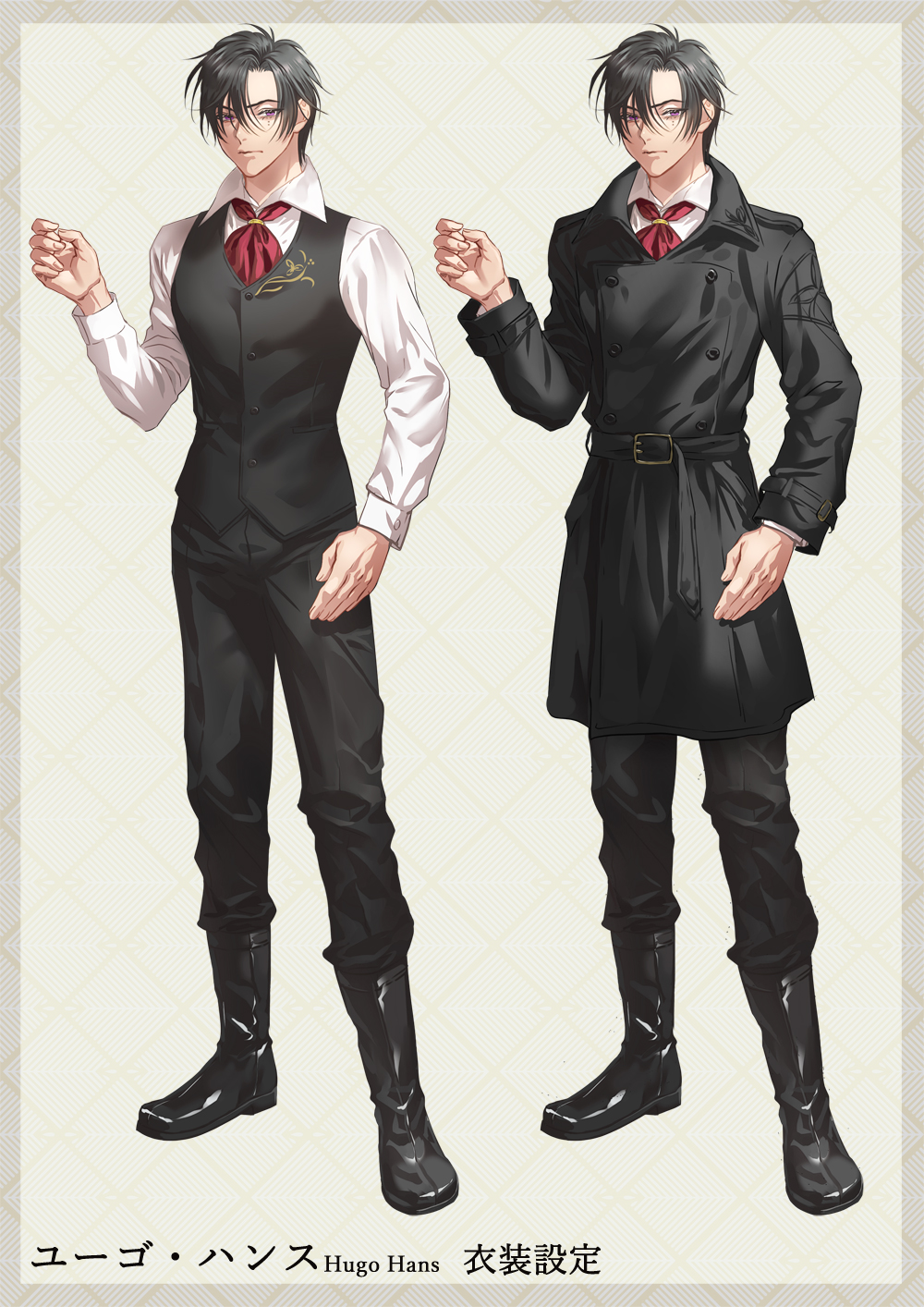 1boy ascot black_footwear black_hair black_pants black_vest character_name coat hand_up highres hugo_hans long_sleeves male_focus multiple_views panmijin99 pants pixiv_fantasia pixiv_fantasia_scepter_of_zeraldia red_ascot shirt short_hair simple_background vest white_shirt