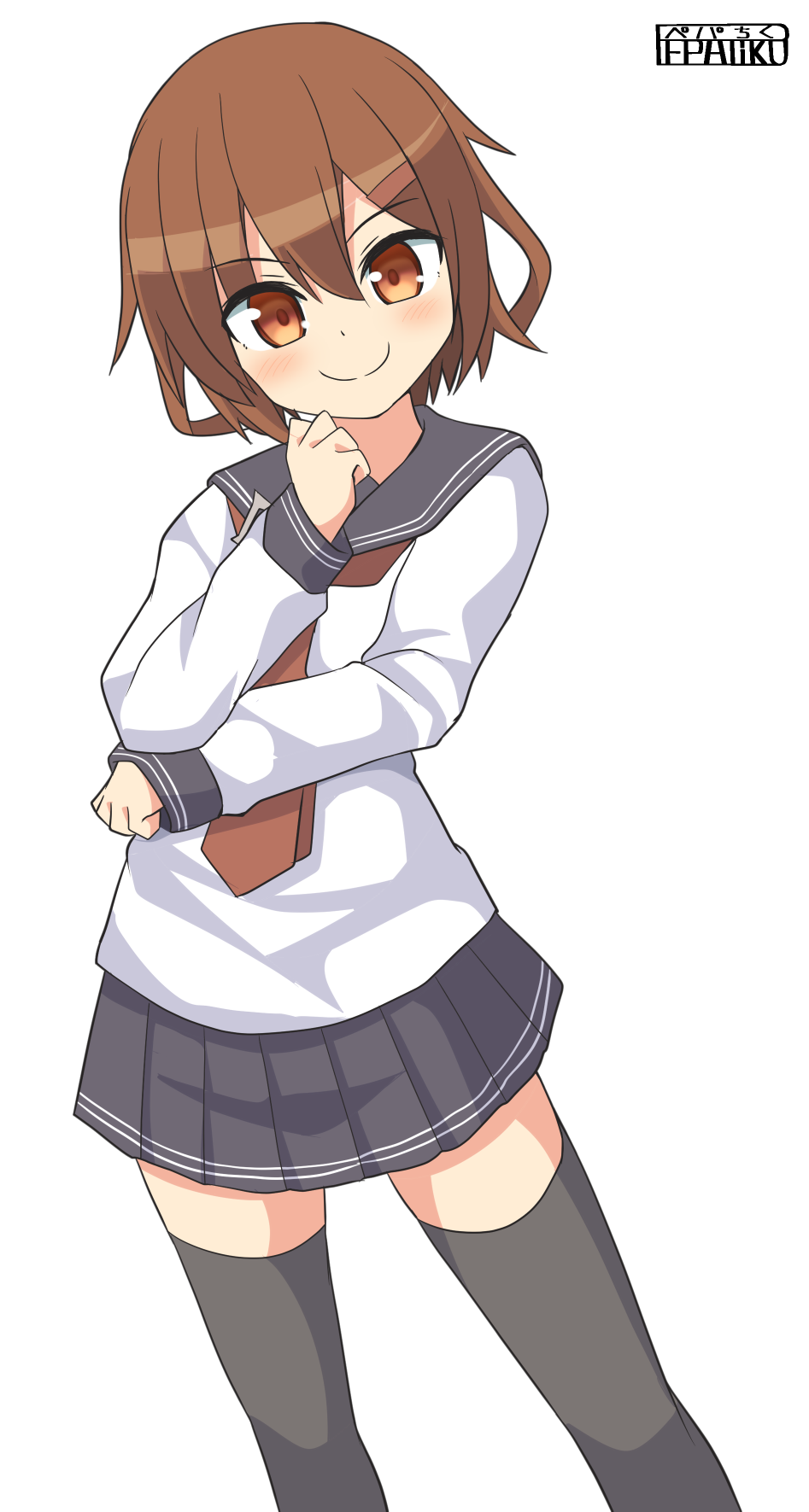 black_thighhighs brown_eyes brown_hair fang hair_ornament hairclip hand_on_own_chin highres ikazuchi_(kancolle) kantai_collection long_sleeves messy_hair miniskirt neckerchief one-hour_drawing_challenge pepatiku red_neckerchief school_uniform serafuku shirt short_hair skirt thighhighs white_shirt