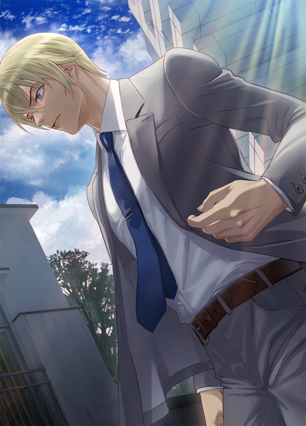1boy amuro_tooru belt blonde_hair blue_eyes blue_necktie blue_sky day dutch_angle formal_clothes grey_pants grey_suit hair_between_eyes highres long_sleeves male_focus meitantei_conan necktie outdoors panmijin99 pants shirt short_hair sky suit sunlight white_shirt