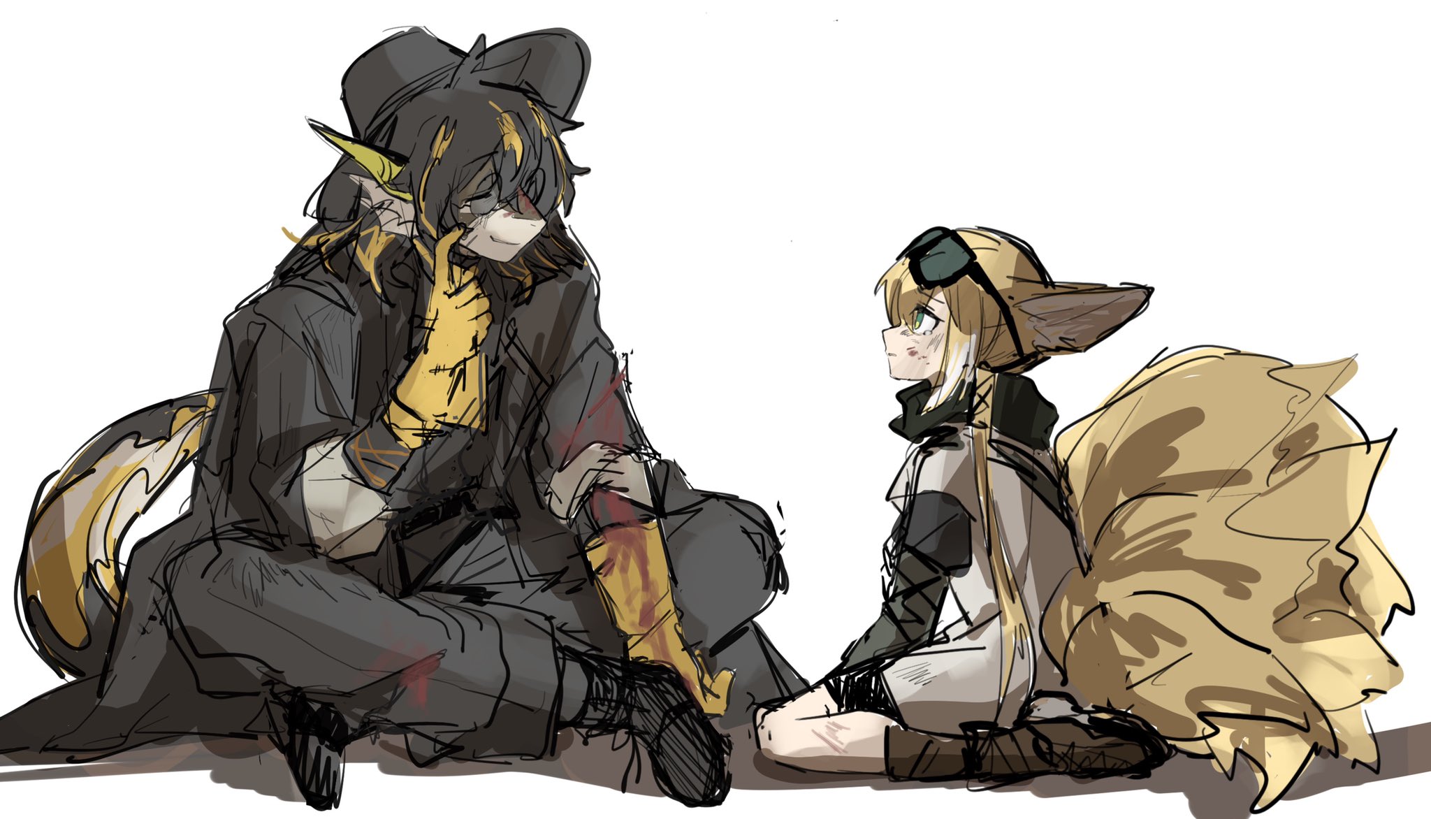 1boy 1girl animal_ear_fluff animal_ears arknights black_footwear black_headwear black_pants black_scarf blonde_hair blood blood_on_clothes boots brown_footwear commentary_request fins fox_ears fox_girl fox_tail gloves goggles goggles_on_head green_eyes hair_between_eyes hat head_fins highres kitsune lee_(arknights) nanataru10 pants parted_lips profile scarf scratching_cheek shadow shoes sitting sketch sunglasses suzuran_(arknights) suzuran_(lostlands_flowering)_(arknights) tail tears wariza white_background yellow_gloves
