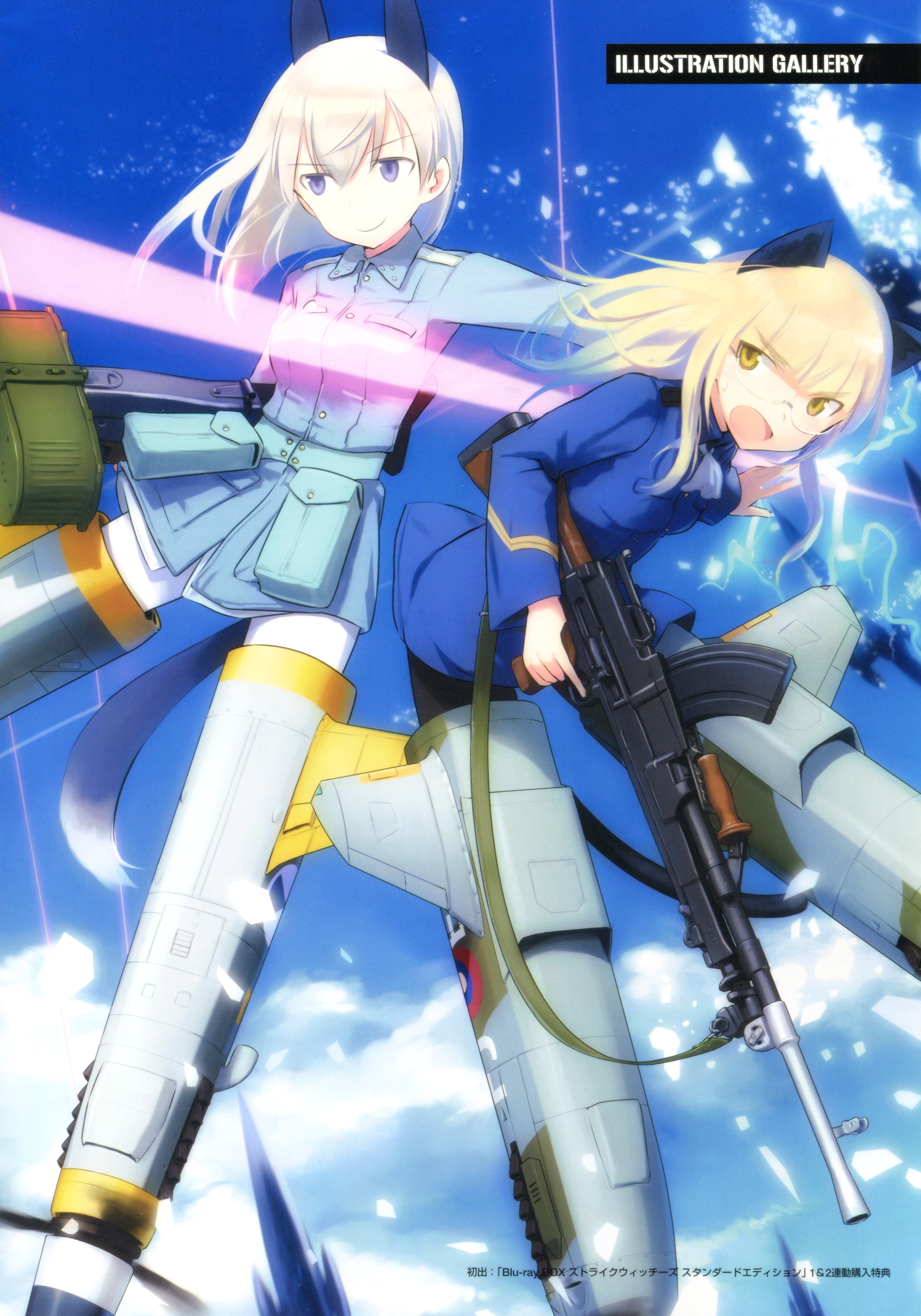 2girls absurdres animal_ears ascot blonde_hair blue_jacket bren_lmg cat_ears cat_girl cat_tail double-drum_magazine drum_magazine eila_ilmatar_juutilainen flying fox_ears fox_girl fox_tail glasses gun high-capacity_magazine highres holding holding_gun holding_weapon jacket laser light_machine_gun lightning long_hair machine_gun magazine_(weapon) mg42 military military_uniform multiple_girls open_mouth perrine_h._clostermann purple_eyes saddle-drum semi-rimless_eyewear sky strike_witches striker_unit tail under-rim_eyewear weapon white_ascot white_hair world_witches_series yellow_eyes