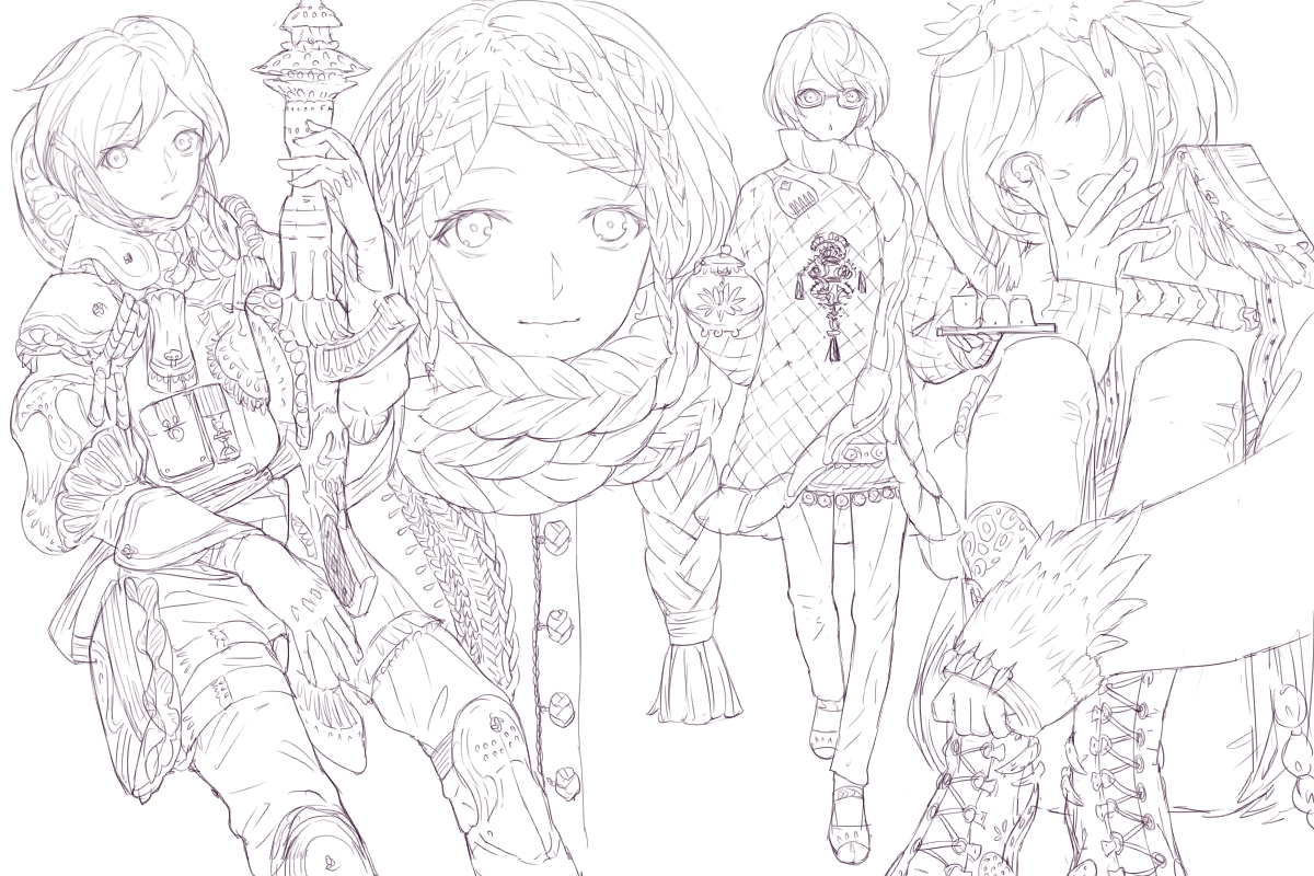 :o ;o alternate_costume androgynous bespectacled boots braid glasses gun hand_to_own_mouth holding holding_gun holding_weapon hugging_own_legs knees_up lace-up_boots long_sleeves looking_at_viewer looking_up male_focus monochrome multiple_braids multiple_views nishihara_isao one_eye_closed pixiv_fantasia pixiv_fantasia_sword_regalia serini_(pixiv_fantasia) short_hair sitting sketch sleeves_past_wrists walking weapon yawning