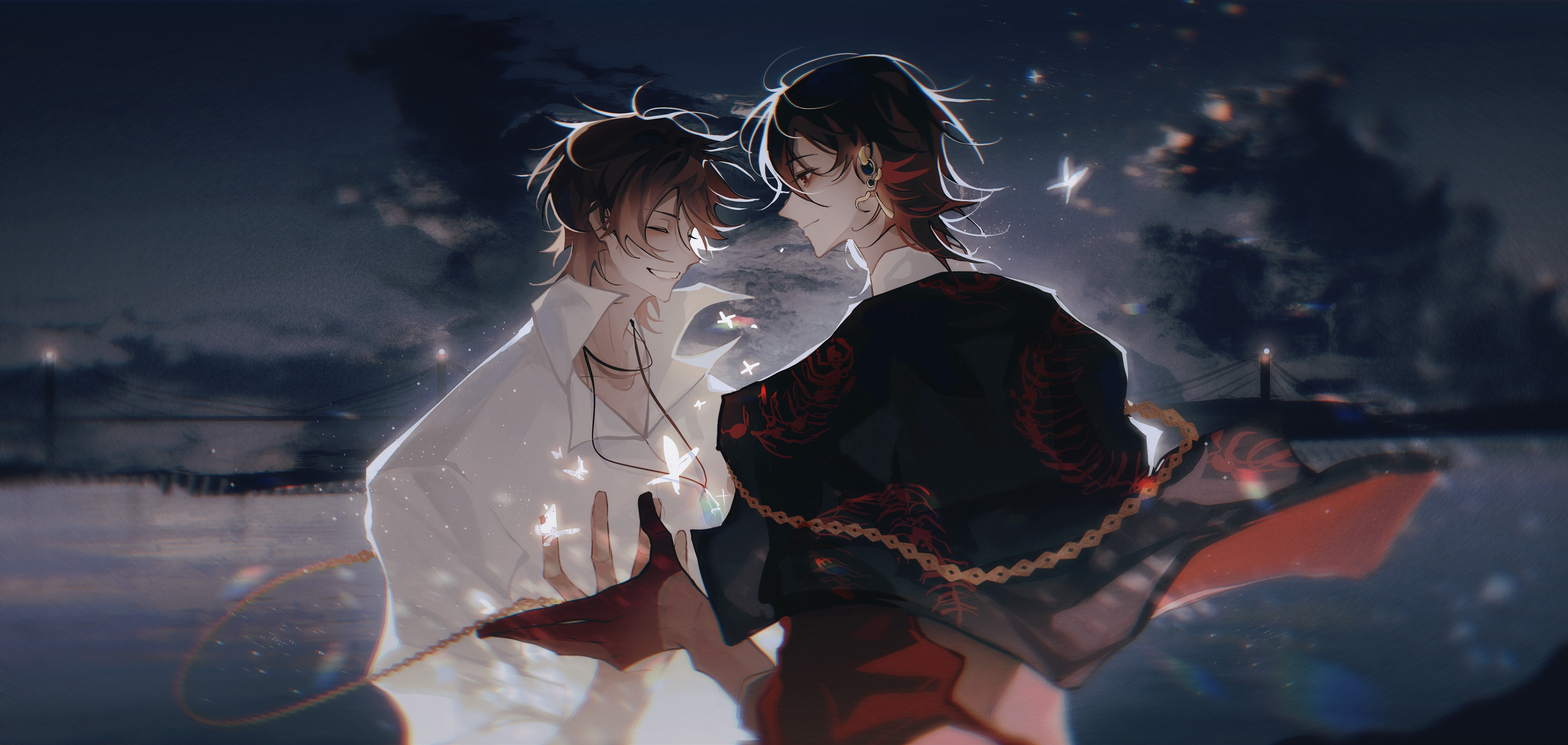 13842862812 2boys absurdres bug butterfly eiden_(nu_carnival) glowing_butterfly highres insect male_focus multiple_boys nu_carnival profile shirt short_hair smile white_shirt yakumo_(nu_carnival)