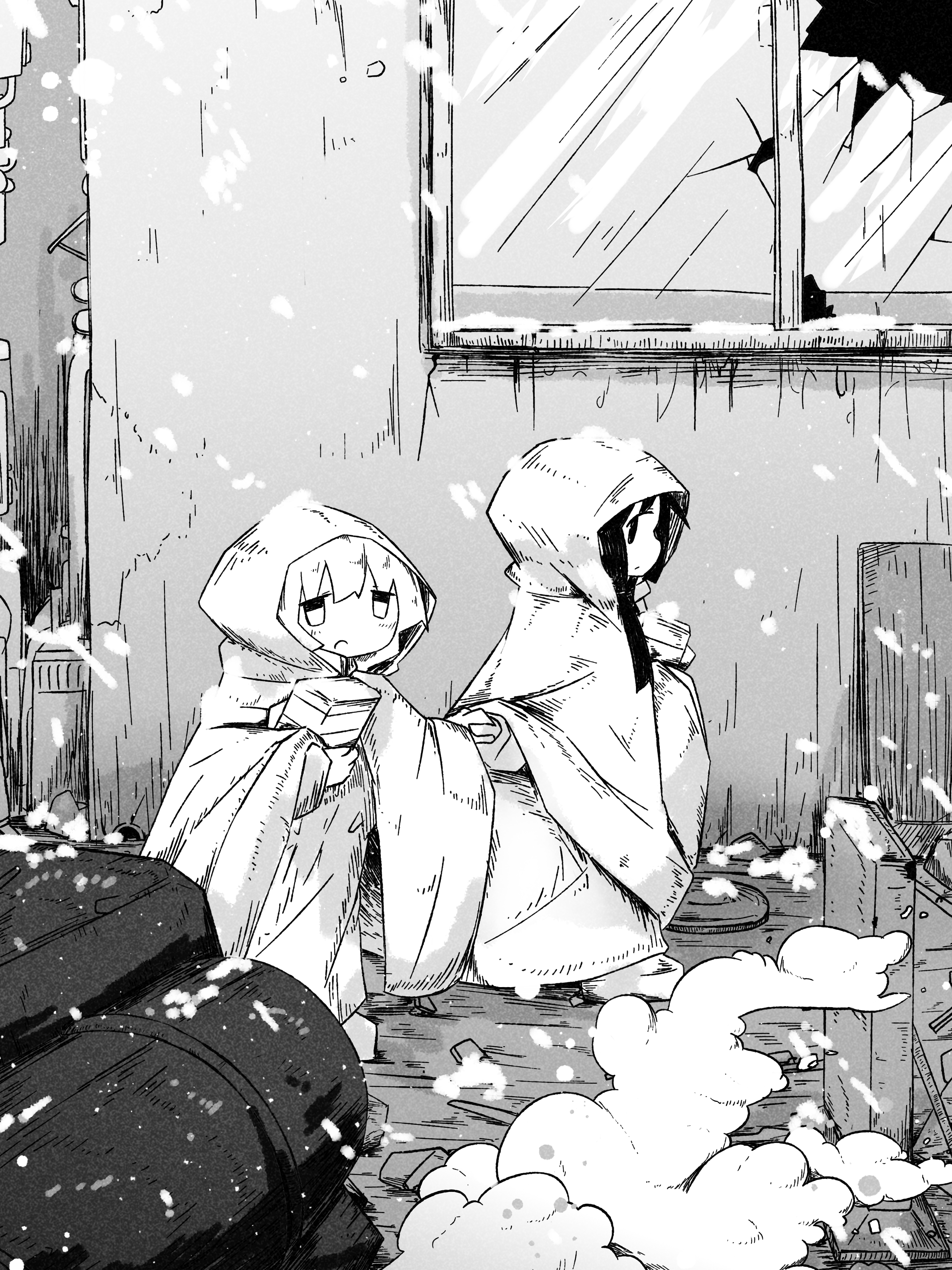 2girls absurdres aged_down black_eyes black_hair blonde_hair broken_window child chito_(shoujo_shuumatsu_ryokou) coat greyscale highres holding holding_hands light_blush low_twintails megateru messy_hair monochrome multiple_girls open_mouth shoujo_shuumatsu_ryokou snow snowing twintails white_coat white_footwear window yuuri_(shoujo_shuumatsu_ryokou)