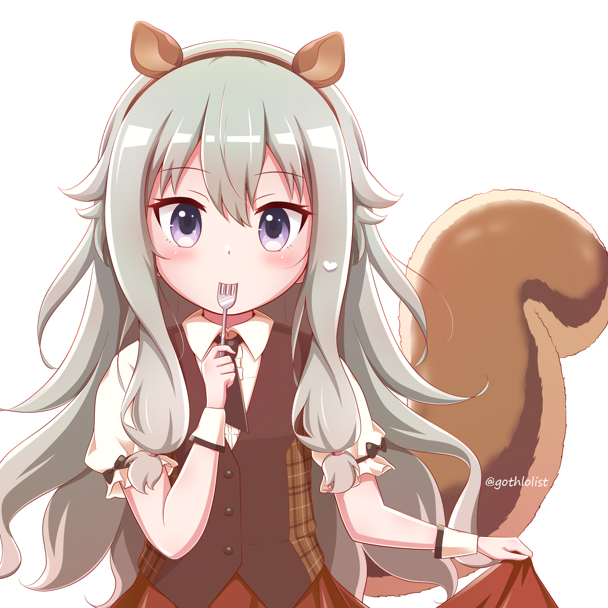 1girl animal_ears black_hairband blush brown_vest center_frills collared_shirt fake_animal_ears fork frills goth_risuto grey_hair hair_between_eyes hairband hand_up highres holding holding_fork kusanagi_nene long_hair looking_at_viewer mabayui_hikari_no_stage_de_(project_sekai) project_sekai puffy_short_sleeves puffy_sleeves purple_eyes red_skirt shirt short_sleeves simple_background skirt solo squirrel_ears squirrel_girl squirrel_tail tail twitter_username very_long_hair vest white_background white_shirt wonderlands_x_showtime_(project_sekai)