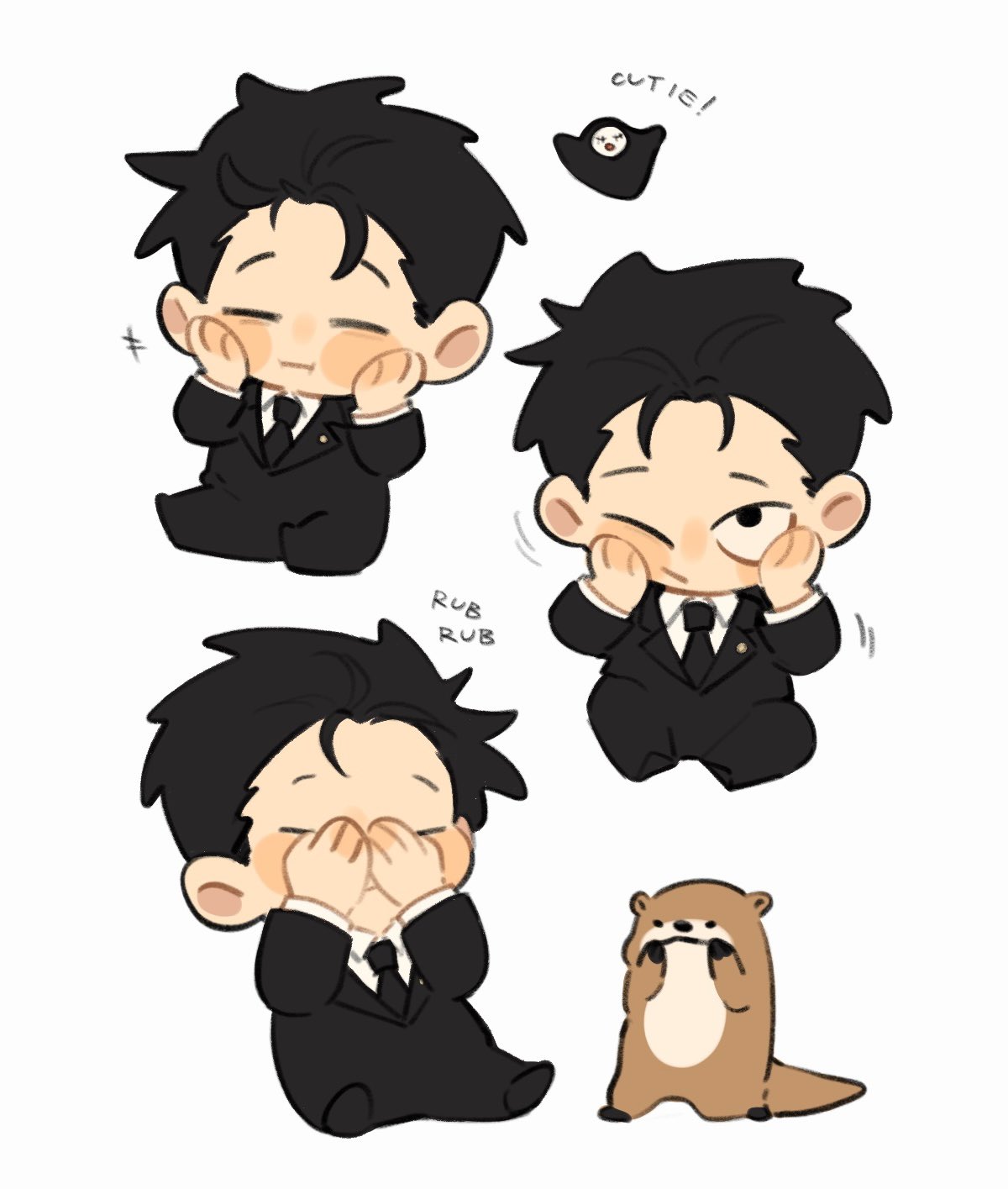 1boy animal black_eyes black_hair black_jacket black_necktie black_pants black_suit chibi closed_eyes closed_mouth commentary covering_face formal_clothes hands_on_own_face highres higuruma_hiromi jacket jujutsu_kaisen long_sleeves looking_at_viewer male_focus multiple_views necktie nnaramonn one_eye_closed otter pants short_hair simple_background sitting suit untranslatable_commentary white_background