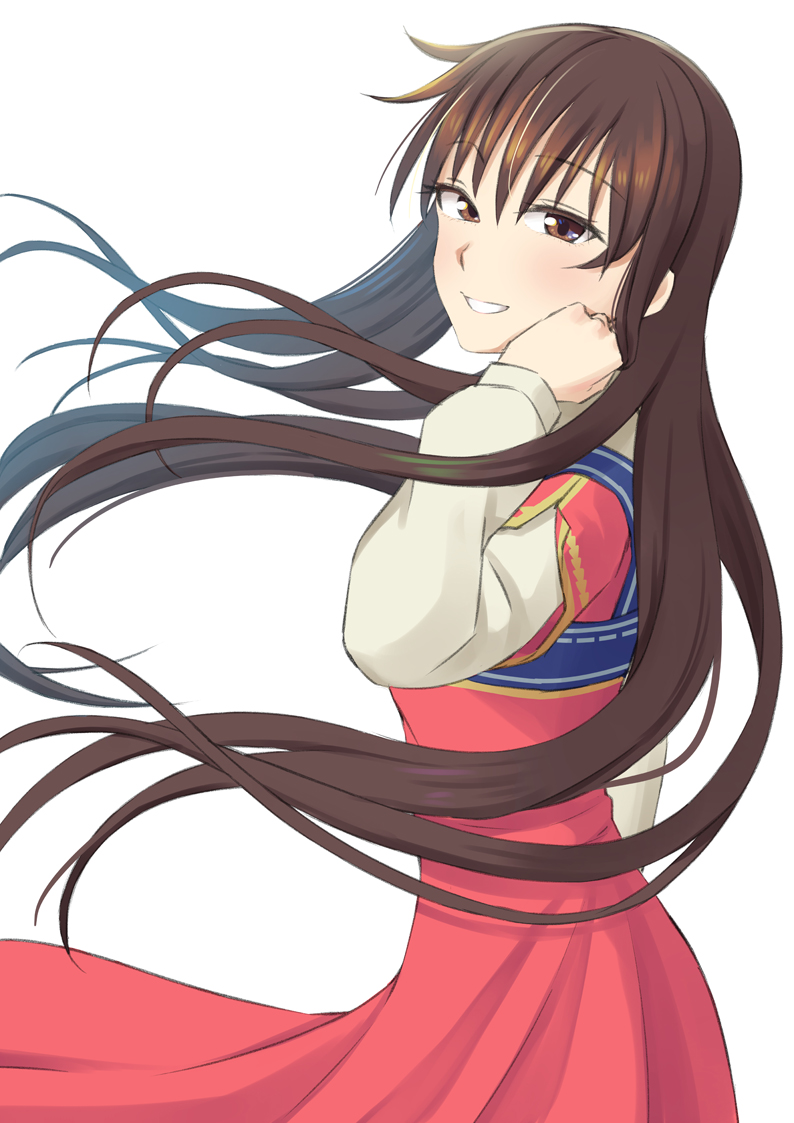 1girl brown_eyes brown_hair dress easy_(aqk7bdqt) floating_hair from_side grin hair_between_eyes layered_sleeves log long_hair long_sleeves looking_at_viewer pinafore_dress red_dress seijo_no_maryoku_wa_bannou_desu short_over_long_sleeves short_sleeves simple_background sleeveless_dress smile solo standing straight_hair takanashi_sei very_long_hair white_background