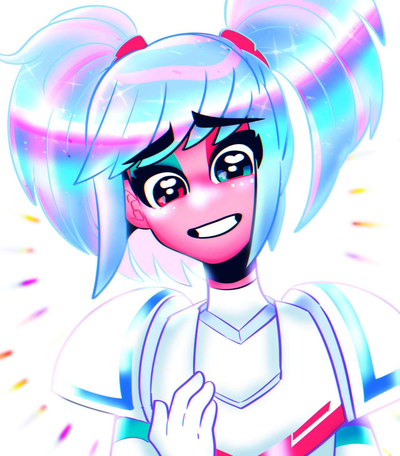 1girl armor blue_eyes blue_hair bodysuit buckeywanderer general_sweet_mayhem heterochromia highres looking_at_viewer medium_hair multicolored_hair red_eyes shoulder_armor simple_background smile solo the_lego_group the_lego_movie the_lego_movie_2:_the_second_part twintails upper_body white_background white_bodysuit