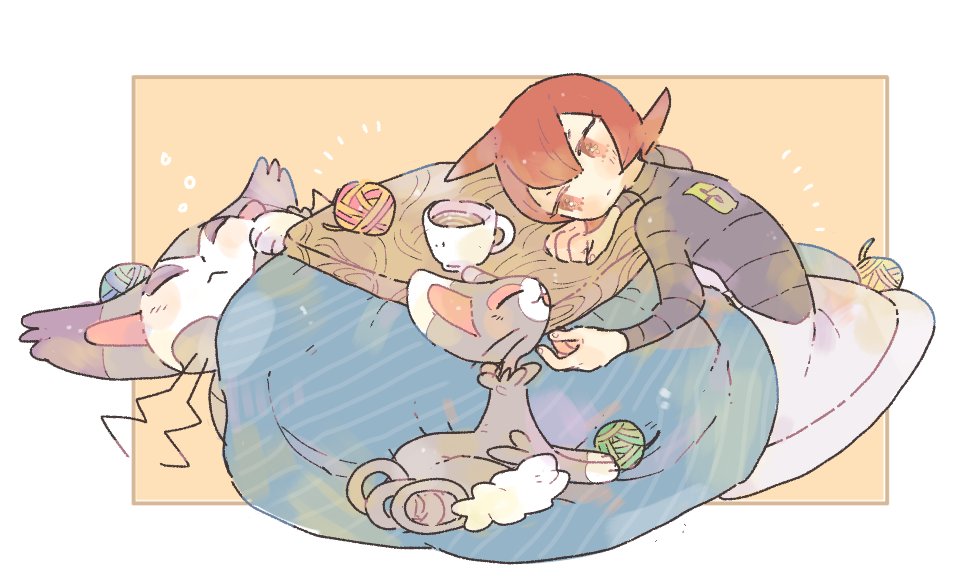 1girl :| black_dress closed_mouth cup dress drink gen_4_pokemon glameow hair_between_eyes katiko kotatsu long_sleeves mars_(pokemon) mug nintendo no_nose orange_eyes petting pokemon pokemon_(creature) pokemon_diamond/pearl/platinum purugly red_hair short_hair sitting table team_galactic turtleneck turtleneck_dress two-tone_dress white_dress yarn yarn_ball