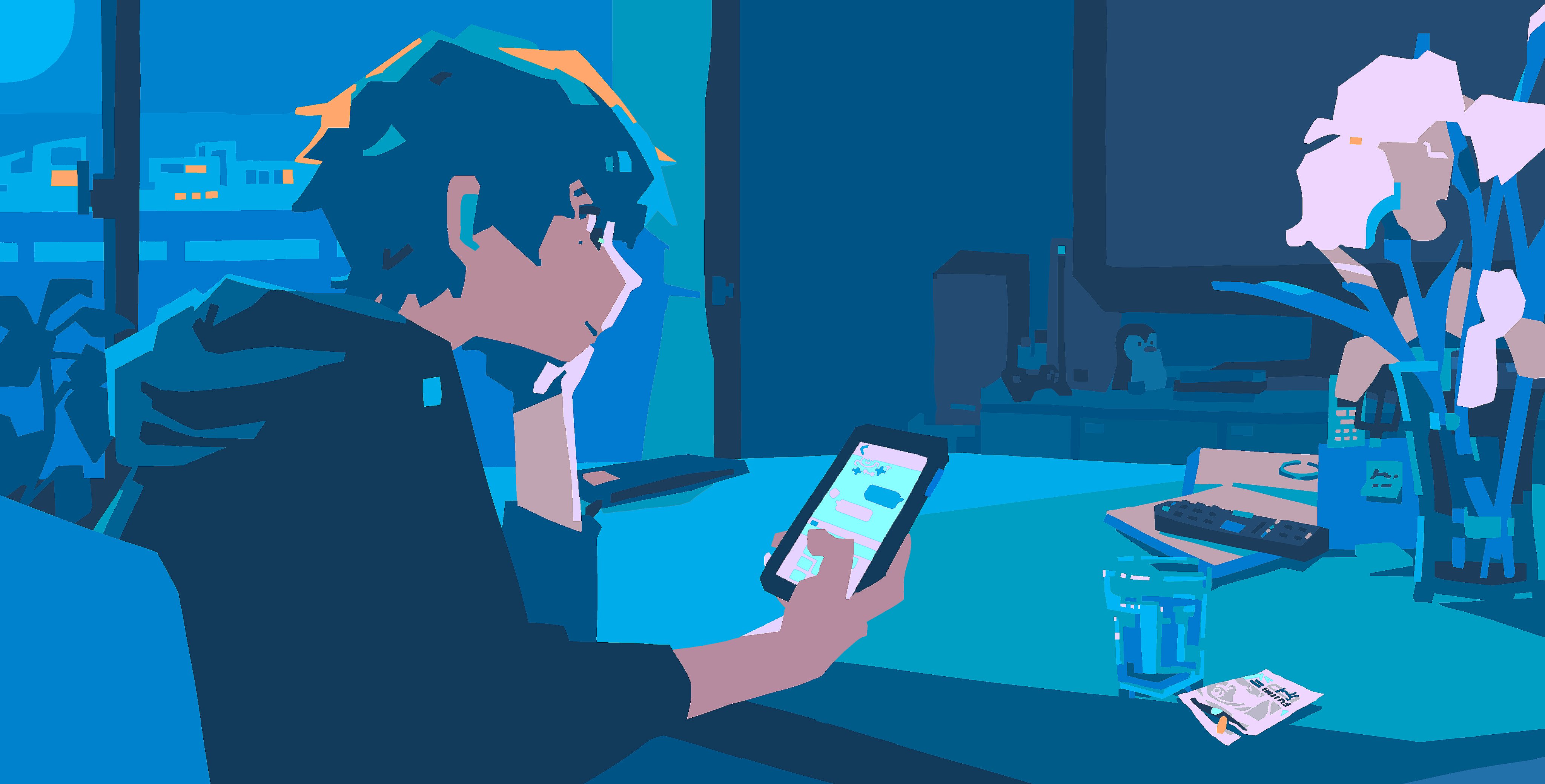 1boy absurdres blue_hair blue_hoodie blue_theme cellphone closed_mouth commentary controller cup drinking_glass english_commentary flat_color flower from_side fujimi_(brand) game_controller hand_on_own_chin head_rest highres holding holding_phone hood hood_down hoodie light_smile limited_palette long_sleeves looking_away male_focus night no_lineart original phone ponsuke_kaikai remote_control short_hair sitting sky smartphone solo stuffed_animal stuffed_penguin stuffed_toy television upper_body white_flower