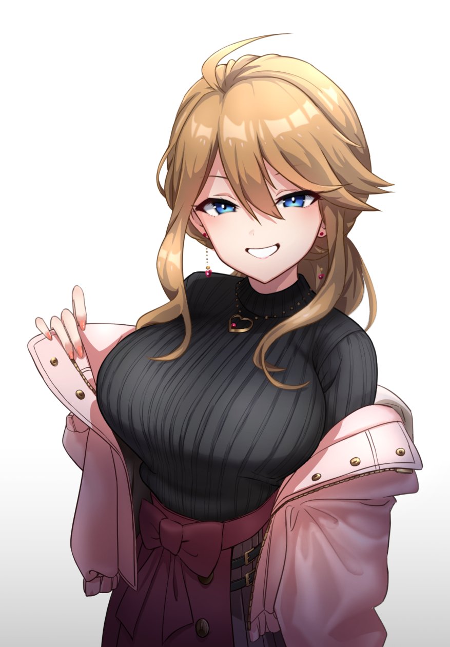 1girl ahoge black_sweater blue_eyes bow breasts brown_hair brown_jacket earrings fingernails grin hair_between_eyes heart heart_earrings heart_necklace highres idolmaster idolmaster_million_live! idolmaster_million_live!_theater_days jacket jewelry junkun148 large_breasts long_fingernails looking_at_viewer medium_hair nail_polish necklace official_alternate_costume open_clothes open_jacket pink_nails private_dress_(idolmaster_million_live!) red_bow smile solo sweater tokoro_megumi white_background
