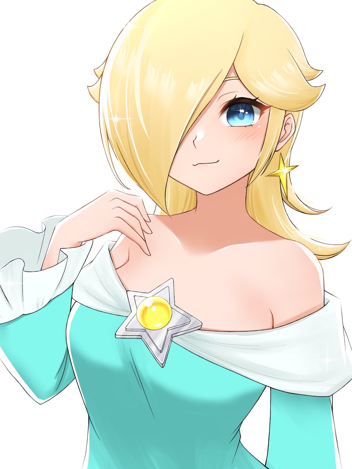 1girl bare_shoulders blonde_hair blue_eyes closed_mouth earrings hair_over_one_eye highres jewelry long_sleeves looking_at_viewer mario_(series) medium_hair nintendo off_shoulder rosalina simple_background smile solo star_(symbol) star_earrings super_mario_galaxy tomatomiya upper_body white_background