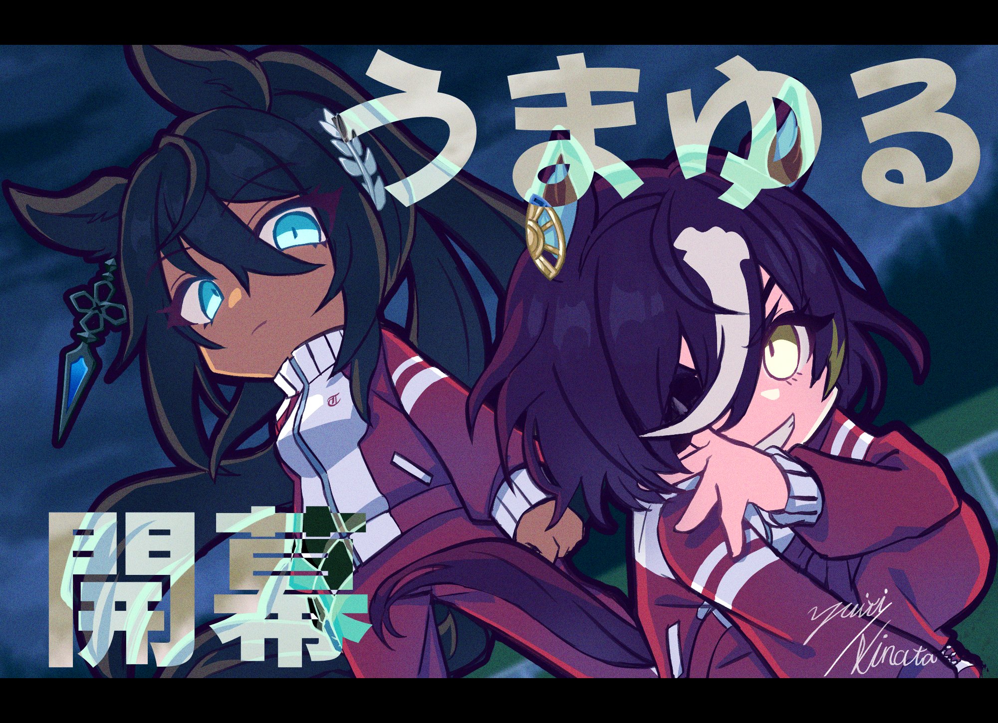 2girls animal_ears black_border blue_eyes border copyright_name dark-skinned_female dark_skin earrings eyepatch hair_between_eyes hair_over_one_eye highres horse_ears horse_girl horse_tail jacket jewelry long_hair long_sleeves looking_at_viewer multicolored_hair multiple_girls official_art short_hair signature single_earring streaked_hair symboli_kris_s_(umamusume) tail tanino_gimlet_(umamusume) tracen_training_uniform track_jacket umamusume umayuru yellow_eyes yuiti_hinata