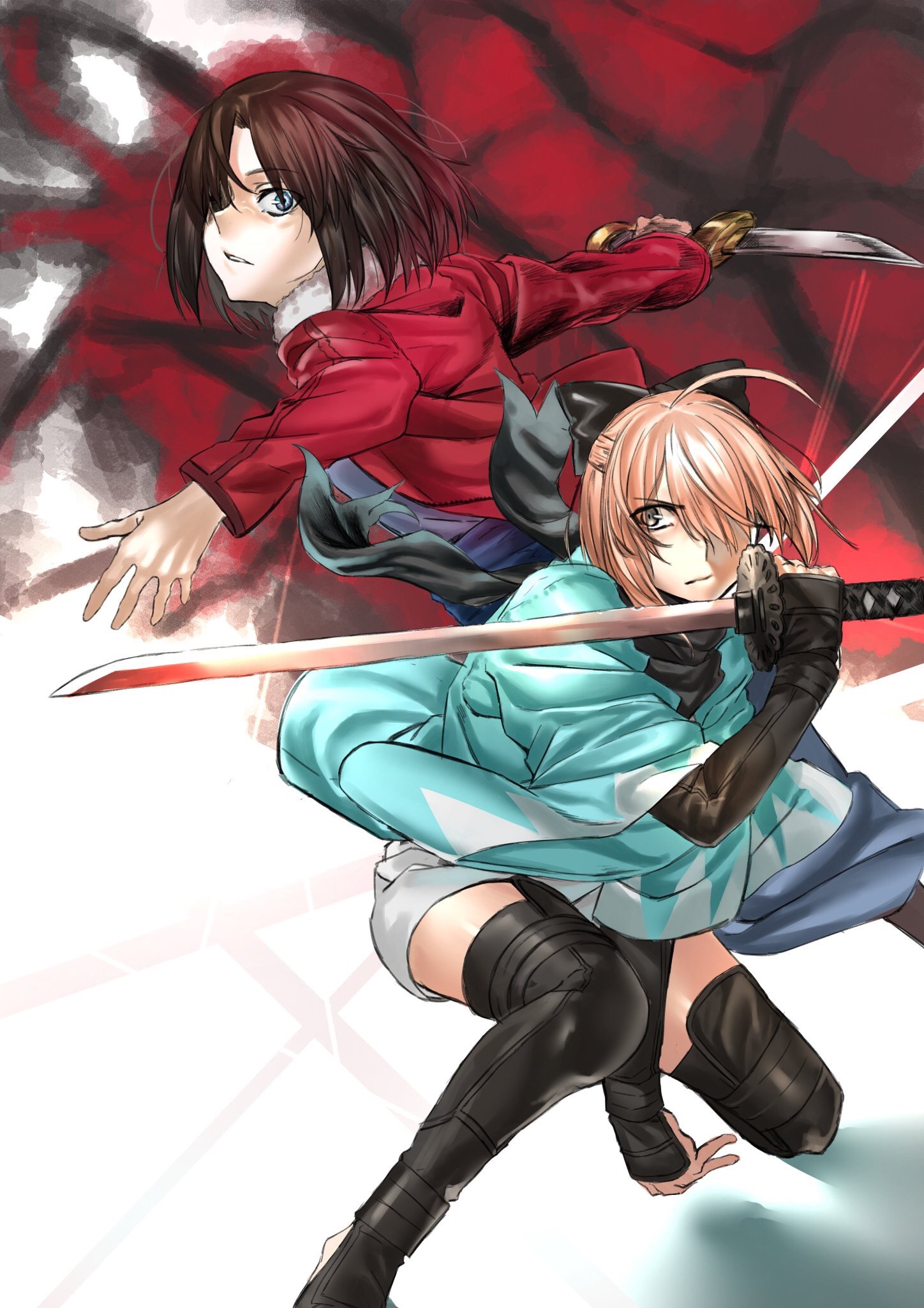 2girls black_gloves black_hair black_thighhighs blonde_hair blue_eyes elbow_gloves fate/grand_order fate_(series) gloves grey_eyes haori highres hiro_(hirohiro_gorira) holding holding_knife holding_sword holding_weapon incoming_attack jacket japanese_clothes kara_no_kyoukai katana kimono knife koha-ace looking_at_viewer multiple_girls okita_souji_(fate) okita_souji_(koha-ace) okita_souji_(third_ascension)_(fate) red_jacket ryougi_shiki scarf short_hair squatting sword thighhighs weapon