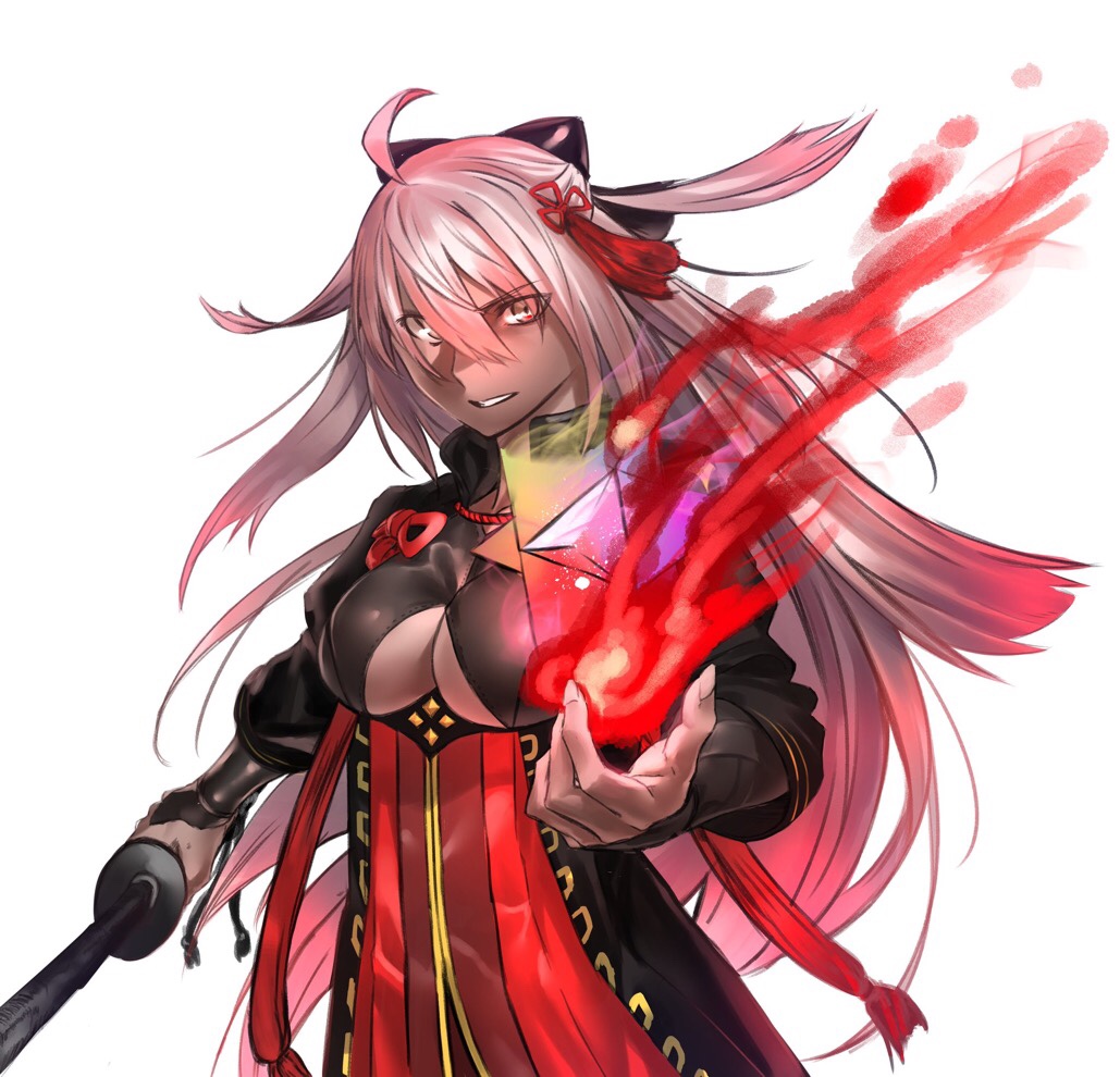 1girl breasts cleavage dark-skinned_female dark_skin eyebrows_hidden_by_hair fate/grand_order fate_(series) fire grey_hair hair_between_eyes hair_ribbon hiro_(hirohiro_gorira) holding holding_sword holding_weapon japanese_clothes katana kimono long_hair looking_at_viewer medium_breasts okita_souji_(fate) okita_souji_alter_(fate) okita_souji_alter_(second_ascension)_(fate) open_mouth ribbon simple_background smile solo sword weapon white_background yellow_eyes