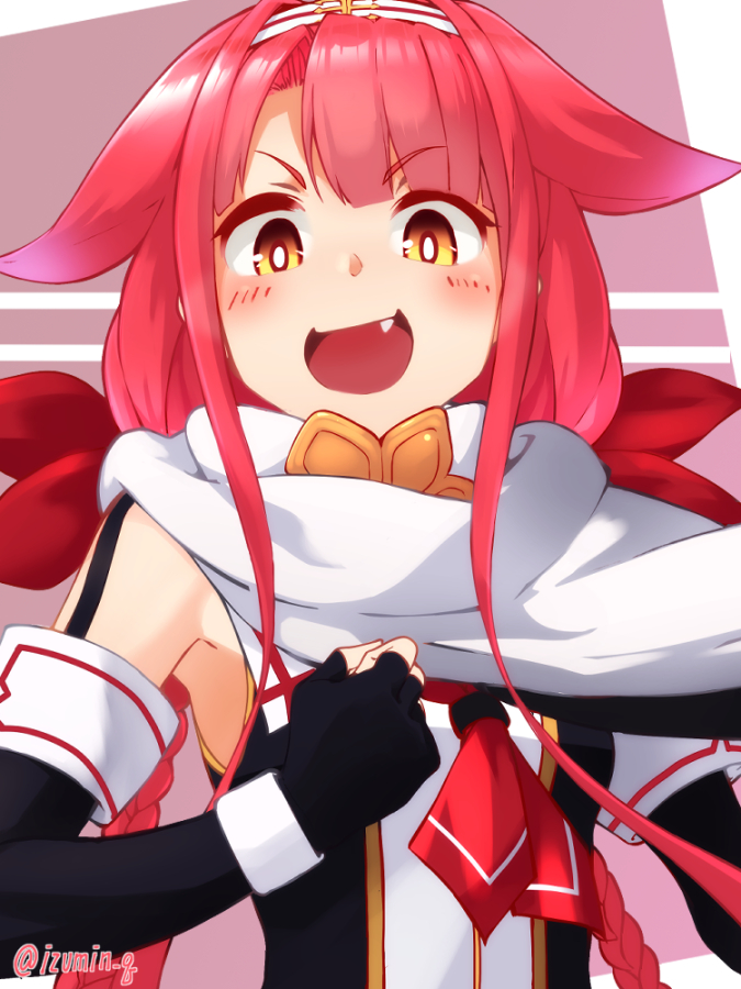 1girl black_gloves black_serafuku blush braid clenched_hand commission elbow_gloves fang fingerless_gloves gloves hair_flaps hair_ribbon hairband izumi_kuma kantai_collection kawakaze_(kancolle) kawakaze_kai_ni_(kancolle) long_hair looking_at_viewer low_twin_braids neckerchief open_mouth orange_eyes red_hair red_neckerchief red_ribbon ribbon sailor_collar scarf school_uniform serafuku sidelocks simple_background skeb_commission solo twin_braids upper_body white_sailor_collar white_scarf