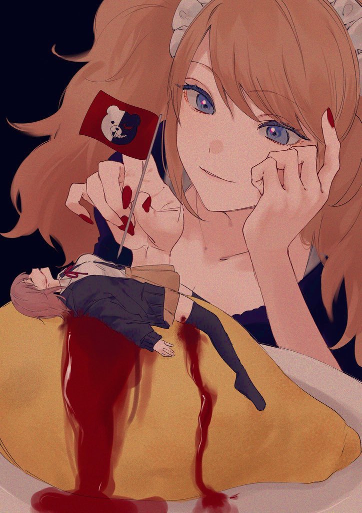 2girls bad_id bad_twitter_id black_background black_jacket black_shirt black_thighhighs blonde_hair blood blood_from_mouth breasts brown_hair chi_(hnnmemi) closed_mouth collarbone danganronpa:_trigger_happy_havoc danganronpa_(series) danganronpa_2:_goodbye_despair egg enoshima_junko food from_side jacket ketchup large_breasts long_hair lying maid_headdress medium_hair mini_person minigirl monokuma multiple_girls nail_polish neck_ribbon no_shoes on_back open_clothes open_jacket red_nails red_ribbon ribbon shirt simple_background thighhighs twintails two-tone_shirt