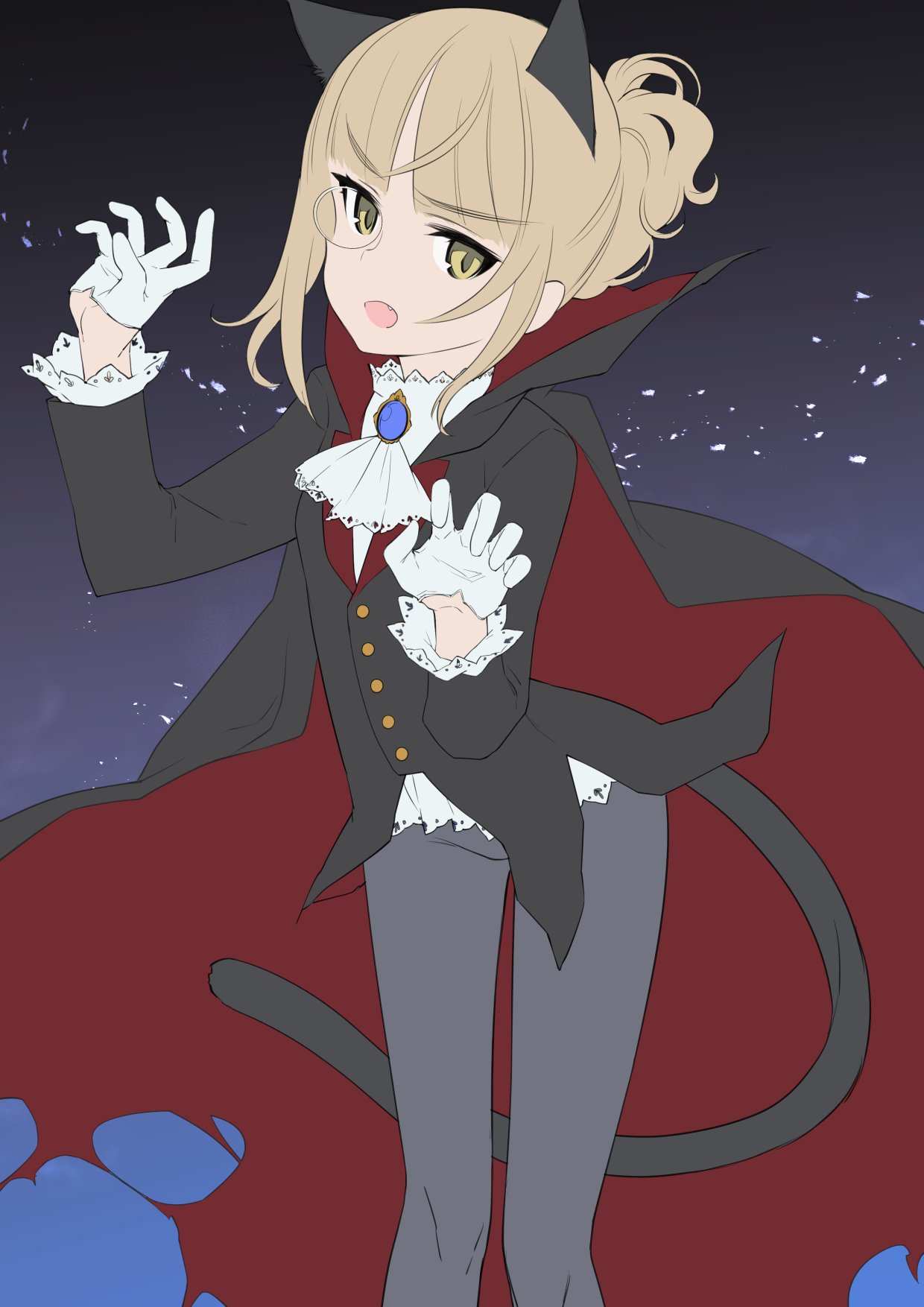 1girl alternate_hairstyle animal_ears aohashi_ame ascot black_cloak black_jacket blazer blonde_hair blunt_bangs brooch cat_ears cat_tail claw_pose cloak commentary_request dreri fang grey_leggings hair_up halloween halloween_costume high_collar highres jacket jewelry lace-trimmed_collar lace_trim leggings looking_at_viewer night perrine_h._clostermann ponytail red_cloak shirt short_hair short_ponytail sidelocks sky solo standing tail two-sided_cloak two-sided_fabric white_ascot white_shirt world_witches_series yellow_eyes
