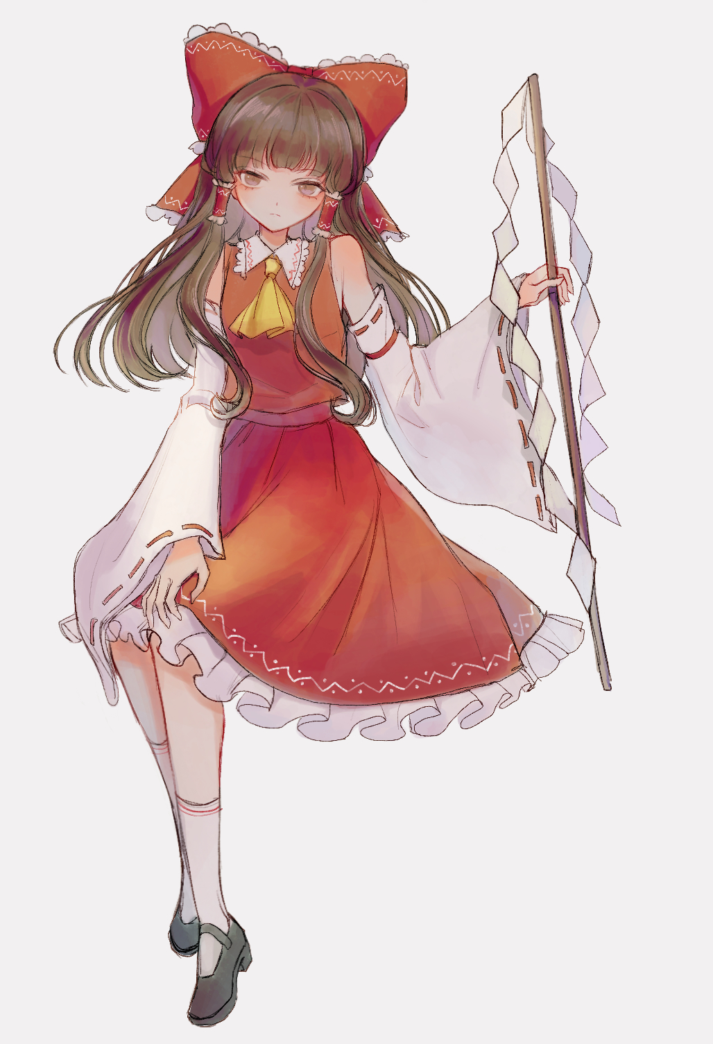 1girl ascot black_footwear bow brown_eyes brown_hair collar detached_sleeves full_body gohei hair_bow hair_tubes hakurei_reimu hat highres hourai_kiriri japanese_clothes long_hair medium_hair nontraditional_miko red_bow red_shirt red_skirt ribbon ribbon-trimmed_sleeves ribbon_trim shirt simple_background skirt skirt_set sleeveless socks solo touhou white_background white_collar white_socks yellow_ascot