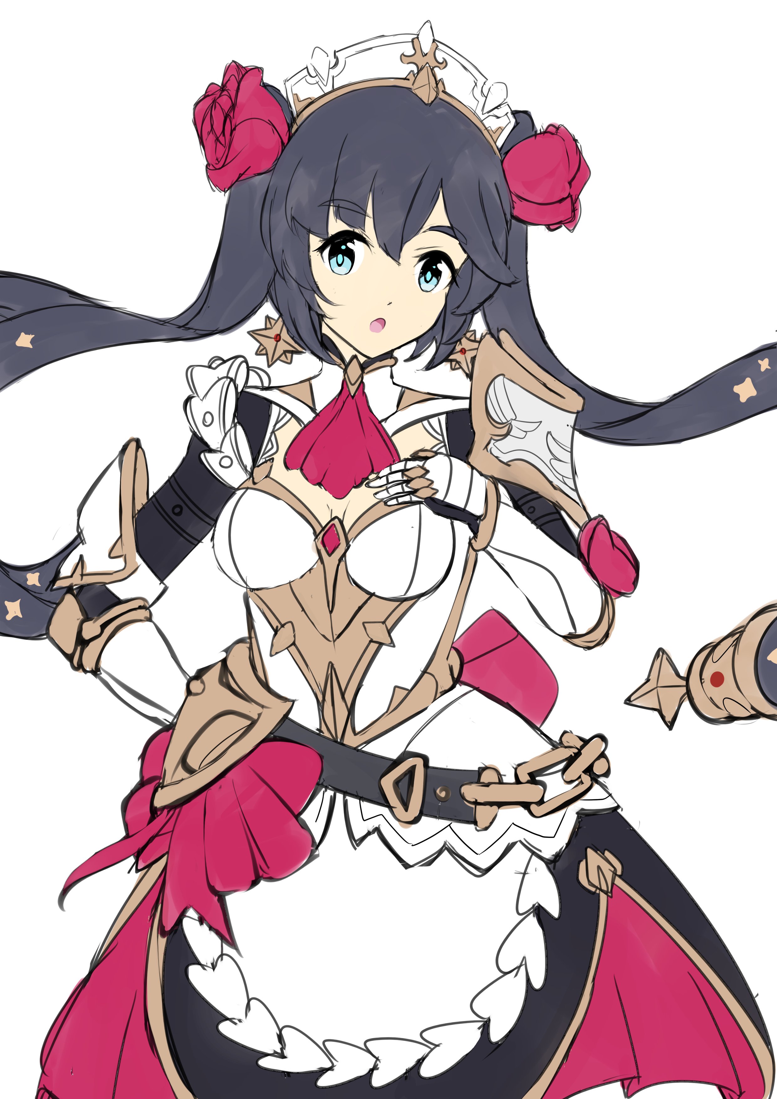 1girl absurdres alternate_costume armor black_hair blue_eyes chestnut_mouth cosplay enmaided flower gauntlets genshin_impact hand_on_own_chest highres long_hair looking_at_viewer maid maid_headdress mona_(genshin_impact) noelle_(genshin_impact) noelle_(genshin_impact)_(cosplay) open_mouth red_flower red_rose rose simple_background solo sudhiro_sappurisa twintails very_long_hair white_background