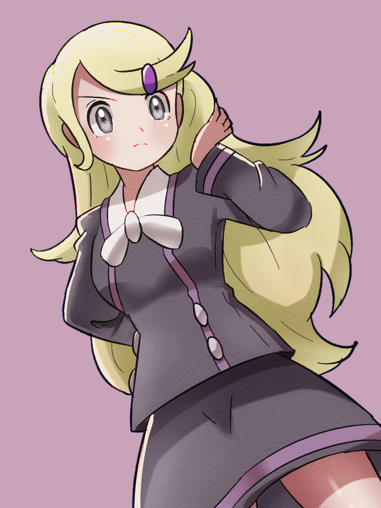 1girl ace_trainer_(female)_(pokemon_xy) ace_trainer_(pokemon) astrid_(pokemon) bangs_pinned_back black_shirt black_skirt blonde_hair grey_eyes hair_ornament hairclip hand_in_own_hair long_hair looking_at_viewer nintendo pink_background pokemon pokemon_x_and_y shirt shugara skirt solo