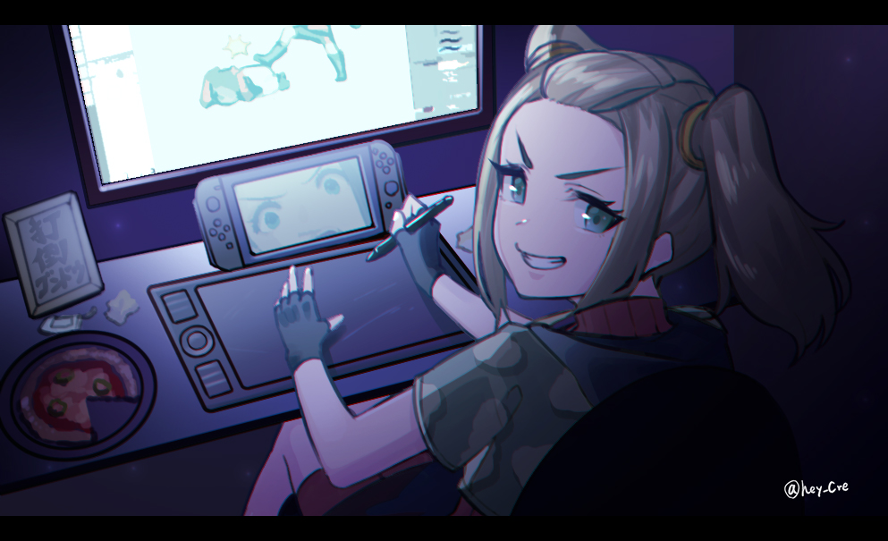 1girl bangs_pinned_back camouflage camouflage_jacket drawing drawing_tablet fingerless_gloves gloves green_eyes grin hair_tie hey_cre jacket light_brown_hair looking_at_viewer monitor nintendo_switch screen_light shania_(xenoblade) sitting smile stylus twintails xenoblade_chronicles_(series) xenoblade_chronicles_3