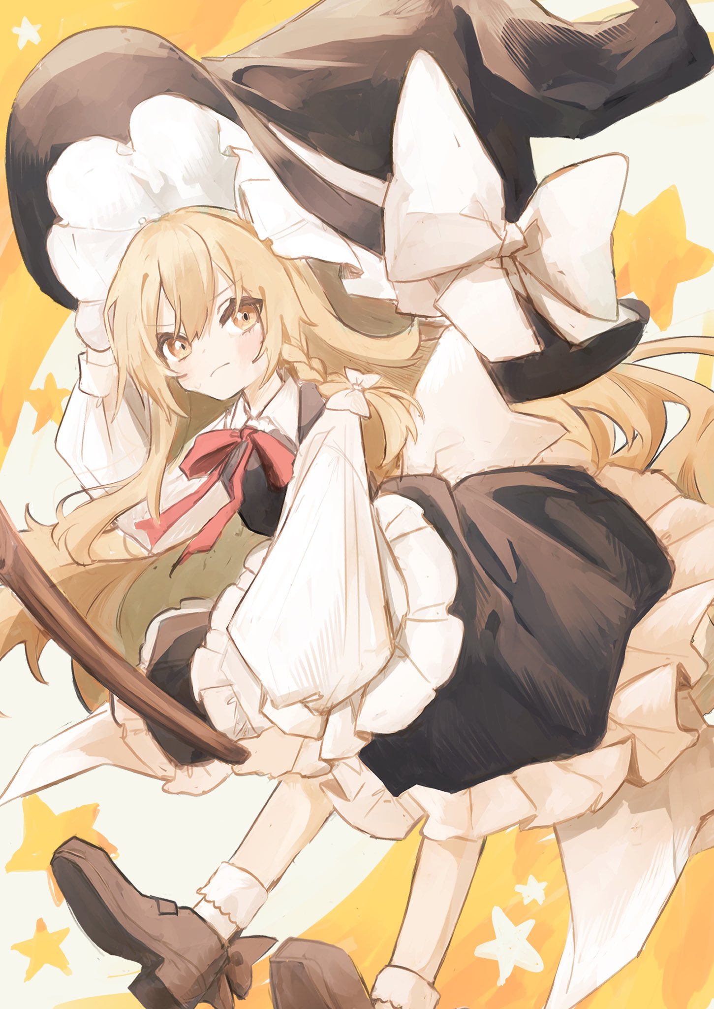 1girl apron black_dress black_hat blonde_hair bow broom broom_riding brown_shoes closed_mouth commentary_request dress frilled_skirt frills full_body hat hat_bow highres holding holding_broom kirisame_marisa long_hair long_sleeves looking_at_viewer puffy_long_sleeves puffy_sleeves red_ribbon ribbon sabatuki shirt shoes skirt socks solo star_(symbol) touhou very_long_hair waist_apron white_apron white_bow white_shirt white_socks witch_hat yellow_eyes