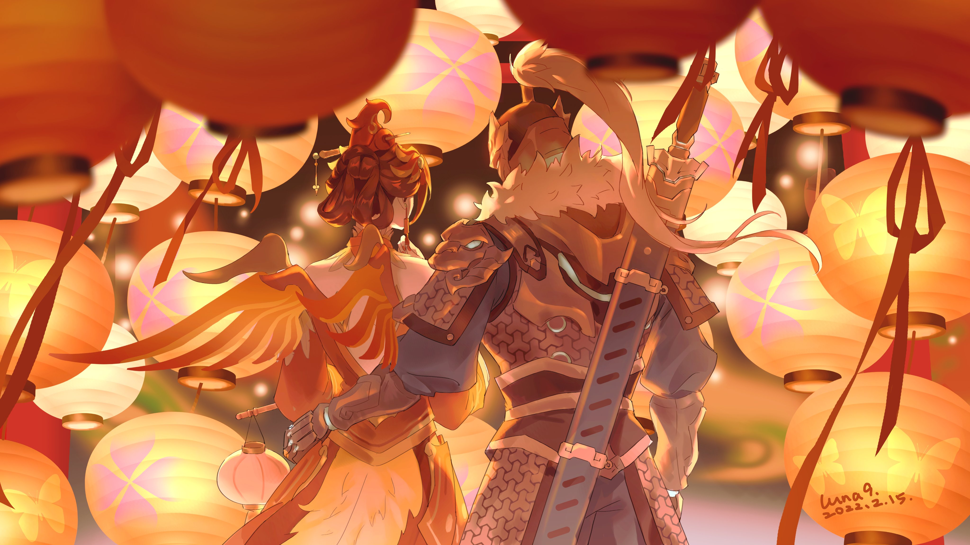1boy 1girl absurdres armor artist_name baihu_genji bare_shoulders blurry blurry_background blurry_foreground boots commentary dated depth_of_field english_commentary from_behind fur_trim genji_(overwatch) hair_ornament hair_rings hairpin hand_on_another's_thigh highres holding holding_lantern katana lantern lantern_festival long_hair luna-9 mercy_(overwatch) miko_mercy official_alternate_costume orange_theme overwatch paper_lantern sky_lantern sword sword_on_back tassel upper_body weapon weapon_on_back wings zhuque_mercy