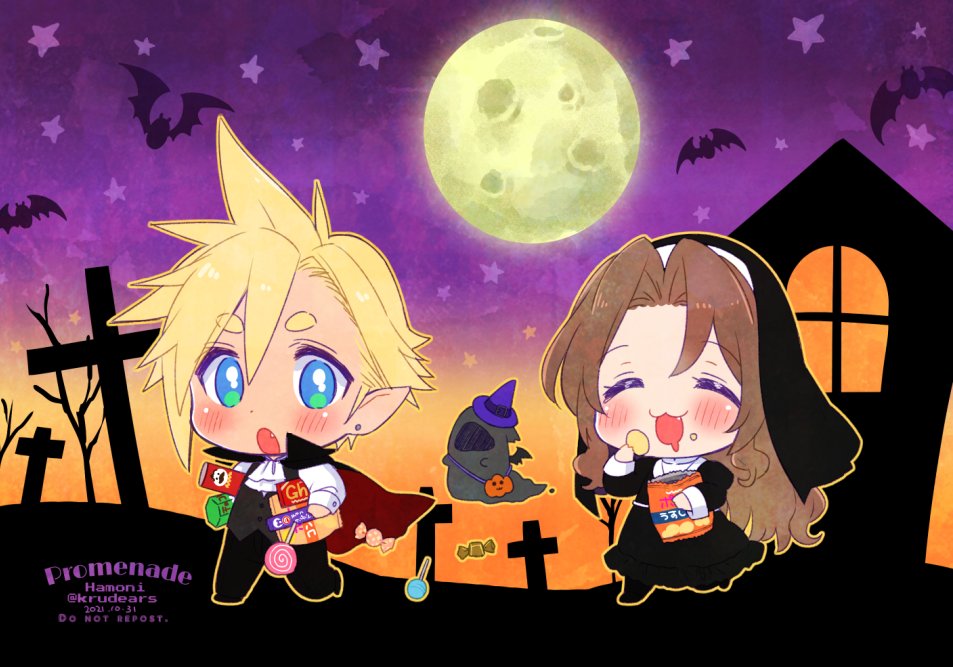 1boy 1girl :3 aerith_gainsborough alternate_costume artist_name ascot bag bat_(animal) black_cape black_dress black_pants blonde_hair blue_eyes blush brown_hair candy cape chibi closed_eyes cloud_strife dated dress earrings eating fang final_fantasy final_fantasy_vii final_fantasy_vii_remake food food_on_face full_moon graveyard grey_vest habit hair_between_eyes halloween_costume hat holding holding_bag jewelry krudears lollipop long_hair long_sleeves mini_hat moon nun nun_headdress open_mouth pants parted_bangs pointy_ears pringles_can red_cape shirt short_hair sidelocks single_earring spiked_hair traditional_nun trick-or-treating twitter_username two-sided_cape two-sided_fabric vampire vest waistcoat wavy_hair white_ascot white_shirt witch_hat