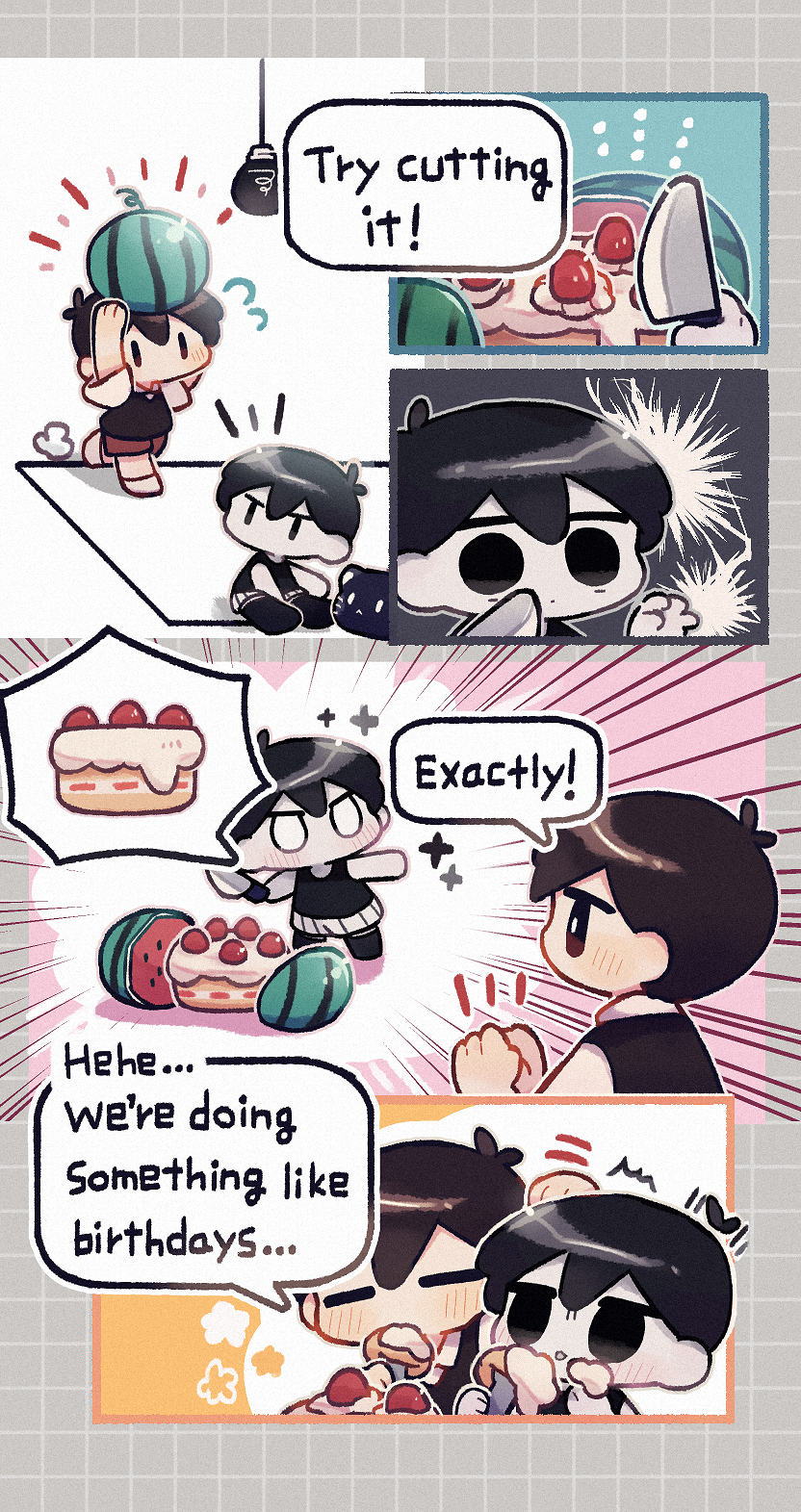 2boys birthday_cake black_eyes black_hair cake chibi closed_eyes comic english_text flying_sweatdrops food fork fruit highres holding holding_fork holding_knife knife light_bulb looking_at_another mewo multiple_boys omori omori_(omori) shirt short_hair short_sleeves speech_bubble sunny_(omori) wakame_(vhai26uhykmqb9k) watermelon white_shirt