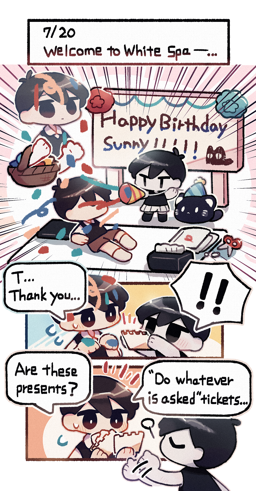 ! !! 2boys black_eyes black_hair cat character_name chibi colored_skin comic confetti english_text happy_birthday hat highres looking_at_another mewo multiple_boys omori omori_(omori) party_hat party_popper short_hair speech_bubble spoken_exclamation_mark sunny_(omori) wakame_(vhai26uhykmqb9k) white_skin