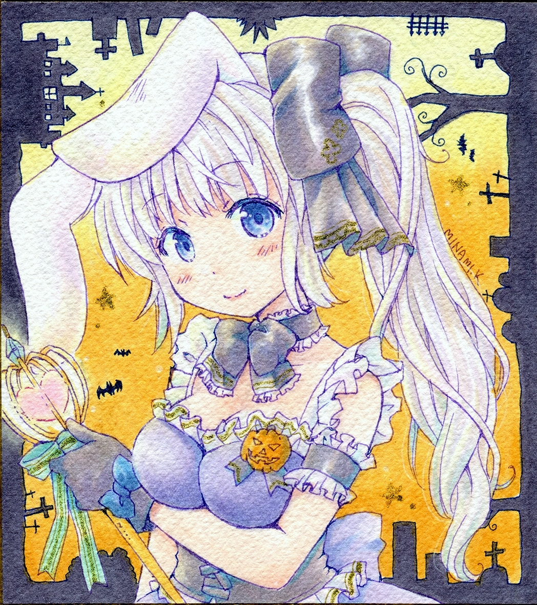 1girl animal_ears armband artist_name back_bow black_bow black_bowtie black_dress black_gloves blue_eyes bow bowtie breast_hold breasts cleavage closed_mouth commentary_request dress frilled_armband frilled_dress frills gloves grey_hair hair_bow halloween holding holding_wand jack-o'-lantern_ornament long_hair looking_at_viewer making-of_available marker_(medium) medium_hair minami_kawa orange_sky original partial_commentary rabbit_ears shikishi side_ponytail signature sky sleeveless sleeveless_dress smile solo traditional_media wand