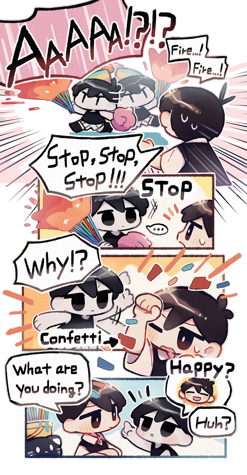 2boys black_eyes black_hair cat chibi colored_skin comic confetti english_text highres mewo multiple_boys omori omori_(omori) short_hair speech_bubble sunny_(omori) wakame_(vhai26uhykmqb9k) white_skin