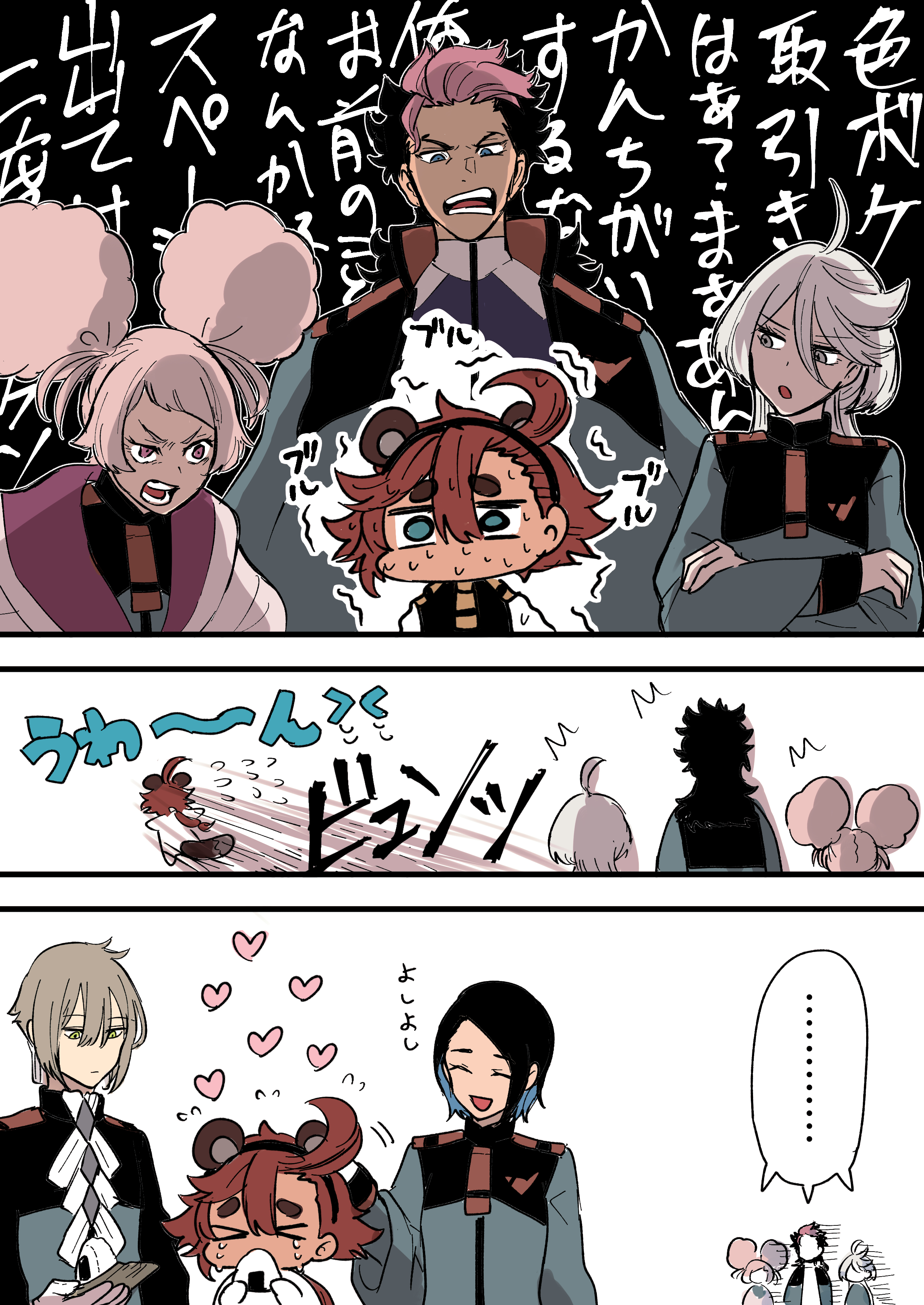 2boys 3koma 4girls absurdres afro_puffs ahoge animal_ears aqua_eyes asticassia_school_uniform black_hairband blue_eyes blue_hair brown_hair chuatury_panlunch comic dark_blue_hair elan_ceres grey_eyes guel_jeturk gundam gundam_suisei_no_majo hair_between_eyes hairband heart highres long_hair looking_at_another low_ponytail mineo406 miorine_rembran multicolored_hair multiple_boys multiple_girls necktie nika_nanaura open_mouth pink_eyes pink_hair ponytail raccoon_ears raccoon_tail red_hair red_necktie school_uniform suletta_mercury swept_bangs tail tanuki text_background thick_eyebrows two-tone_hair white_hair white_necktie