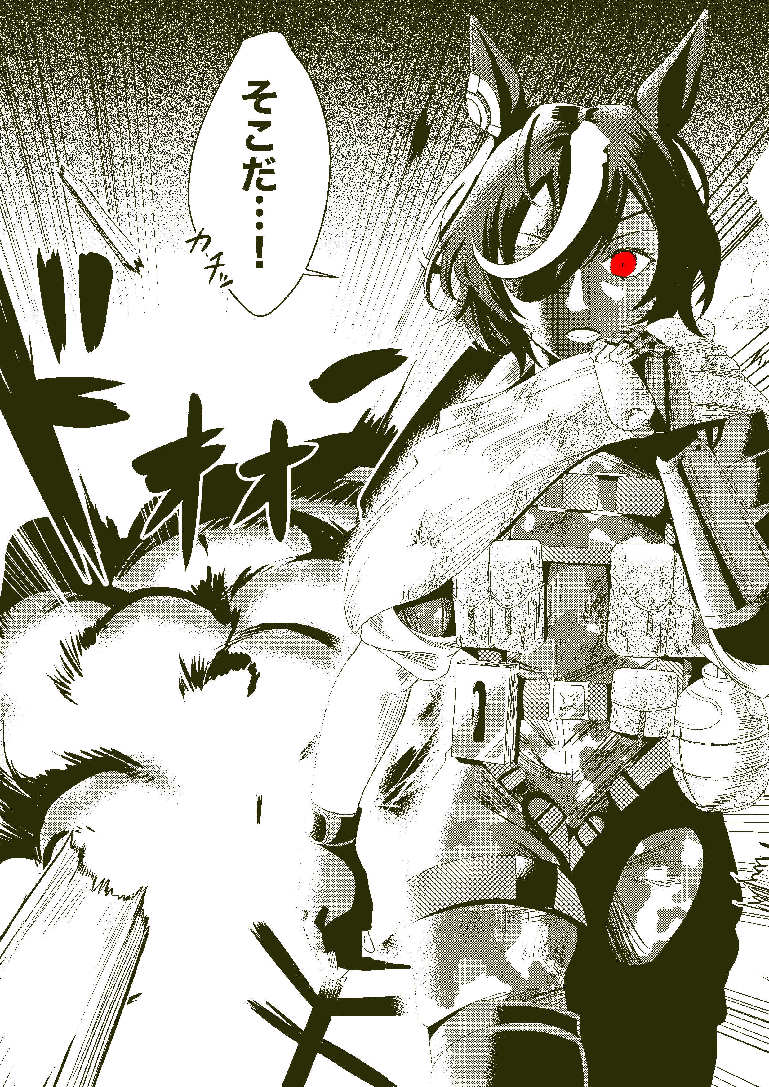 1girl absurdres camouflage canteen carrot comic commentary cosplay cowboy_shot ear_ornament emphasis_lines explosion eyepatch fingerless_gloves food gloves hair_over_one_eye highres holding holding_food looking_at_viewer metal_gear_(series) metal_gear_solid_v:_the_phantom_pain military_fatigues military_uniform natuumi_(jmwy5354) prosthesis prosthetic_arm red_eyes scarf single_glove solo spot_color tanino_gimlet_(umamusume) trait_connection umamusume venom_snake venom_snake_(cosplay) walking wood