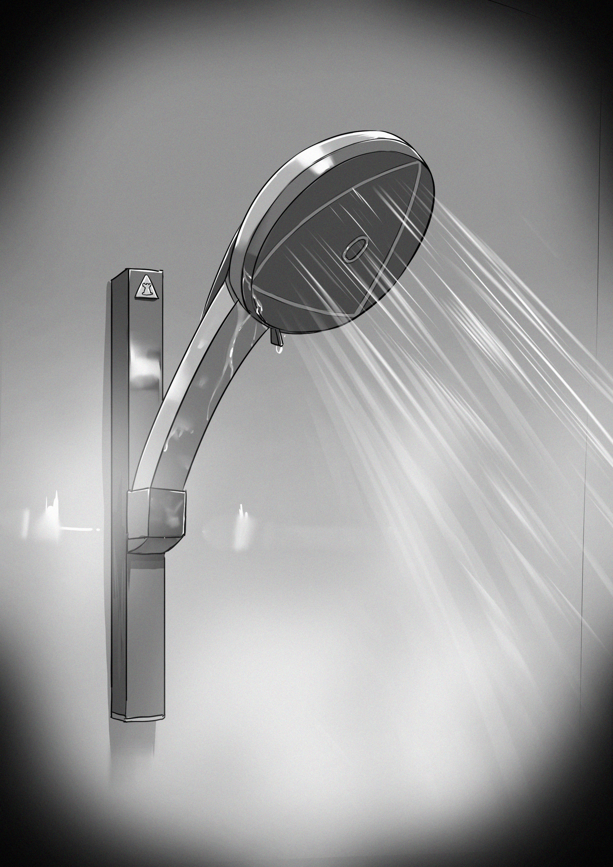 absurdres arknights comic greyscale highres monochrome no_humans rhode saikre shower_(place) shower_head silent_comic water