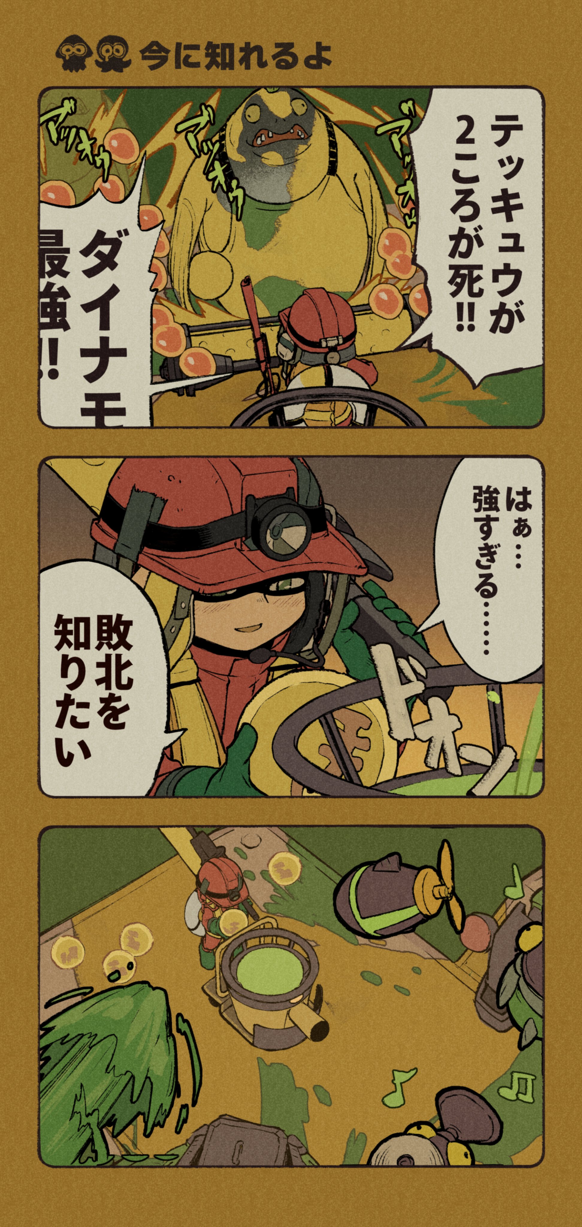 1girl 3koma absurdres big_shot_(splatoon) black_eyes blonde_hair blush boots border colored_sclera comic dirty dirty_clothes drizzler_(splatoon) dynamo_roller_(splatoon) earpiece female_focus fish_stick_(splatoon) from_above from_behind full_body gloves golden_egg_(splatoon) green_eyes green_footwear green_gloves green_overalls half-closed_eyes hands_up happy headlamp helmet highres holding impending_doom ink inkling inkling_girl inkling_player_character iwamushi japanese_text jumpsuit lifebuoy multiple_views musical_note nintendo octoling octoling_player_character open_mouth orange_headwear orange_jumpsuit over_shoulder overalls salmon_run_(splatoon) scrapper_(splatoon) sidelocks slime_(substance) smile speech_bubble splatoon_(series) splatoon_3 standing steel_eel_(splatoon) swim_ring talking teeth tentacle_hair tentacles translation_request wall-eyed weapon weapon_over_shoulder yellow_border yellow_sclera