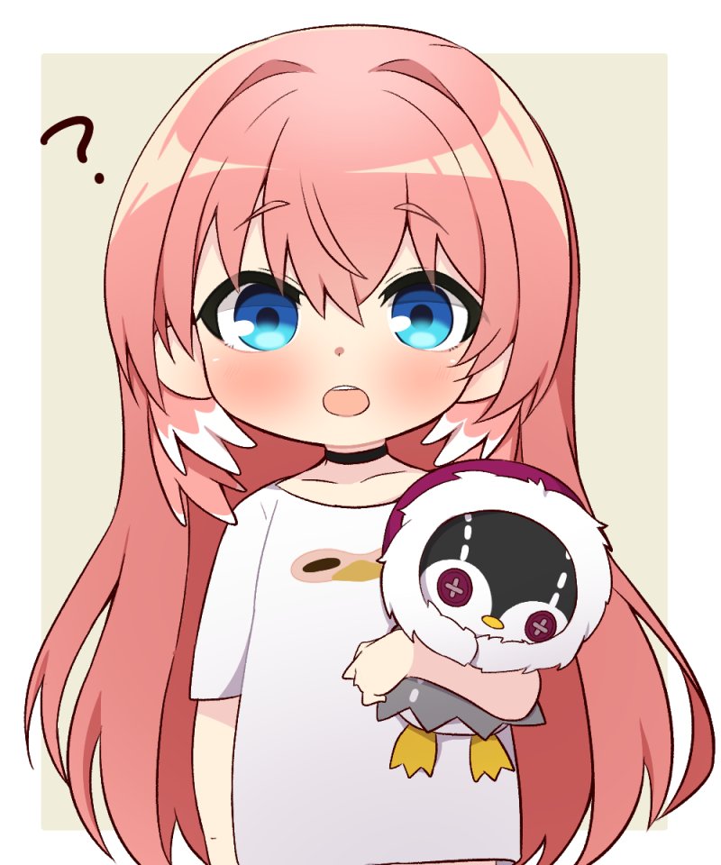 1girl ? aged_down black_choker blue_eyes blush border child choker collarbone commentary dot_nose forehead hair_between_eyes holding holding_stuffed_toy hololive long_hair looking_at_viewer multicolored_hair open_mouth pink_hair shirt short_sleeves simple_background solo streaked_hair stuffed_animal stuffed_penguin stuffed_toy takane_lui twumi upper_body virtual_youtuber white_border white_hair white_shirt