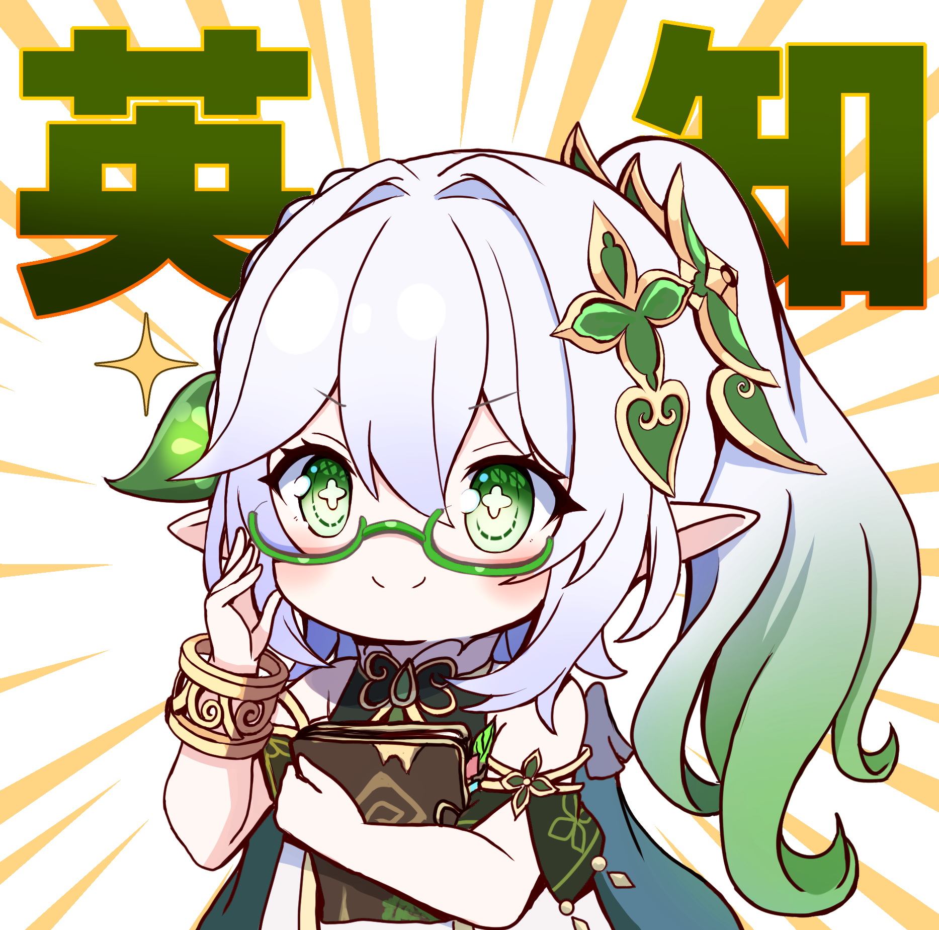 >:) 1girl text_background bare_shoulders bespectacled blush book closed_mouth commentary_request cross-shaped_pupils dress genshin_impact glasses gradient_hair green-framed_eyewear green_eyes green_hair grey_hair hair_between_eyes hair_intakes hand_up highres holding holding_book multicolored_hair nahida_(genshin_impact) pointy_ears semi-rimless_eyewear shibakame sleeveless sleeveless_dress smile solo symbol-shaped_pupils translation_request under-rim_eyewear v-shaped_eyebrows white_background white_dress