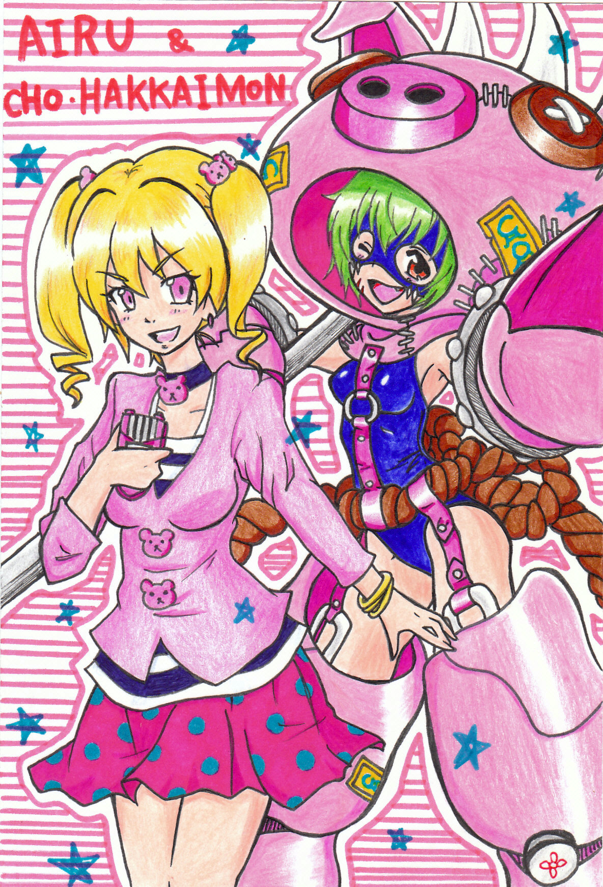 2girls cho-hakkaimon costume digimon digimon_xros_wars digimon_xros_wars:_toki_wo_kakeru_shounen_hunter-tachi highres multiple_girls one-piece_swimsuit pig skirt suzaki_airu swimsuit twintails
