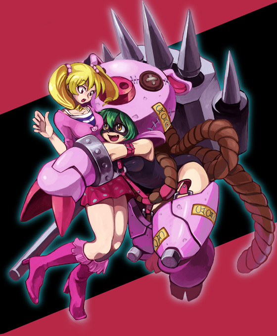 2girls cho-hakkaimon digimon digimon_xros_wars digimon_xros_wars:_toki_wo_kakeru_shounen_hunter-tachi hug looking_at_another mask multiple_girls one-piece_swimsuit pig skirt suzaki_airu swimsuit twintails