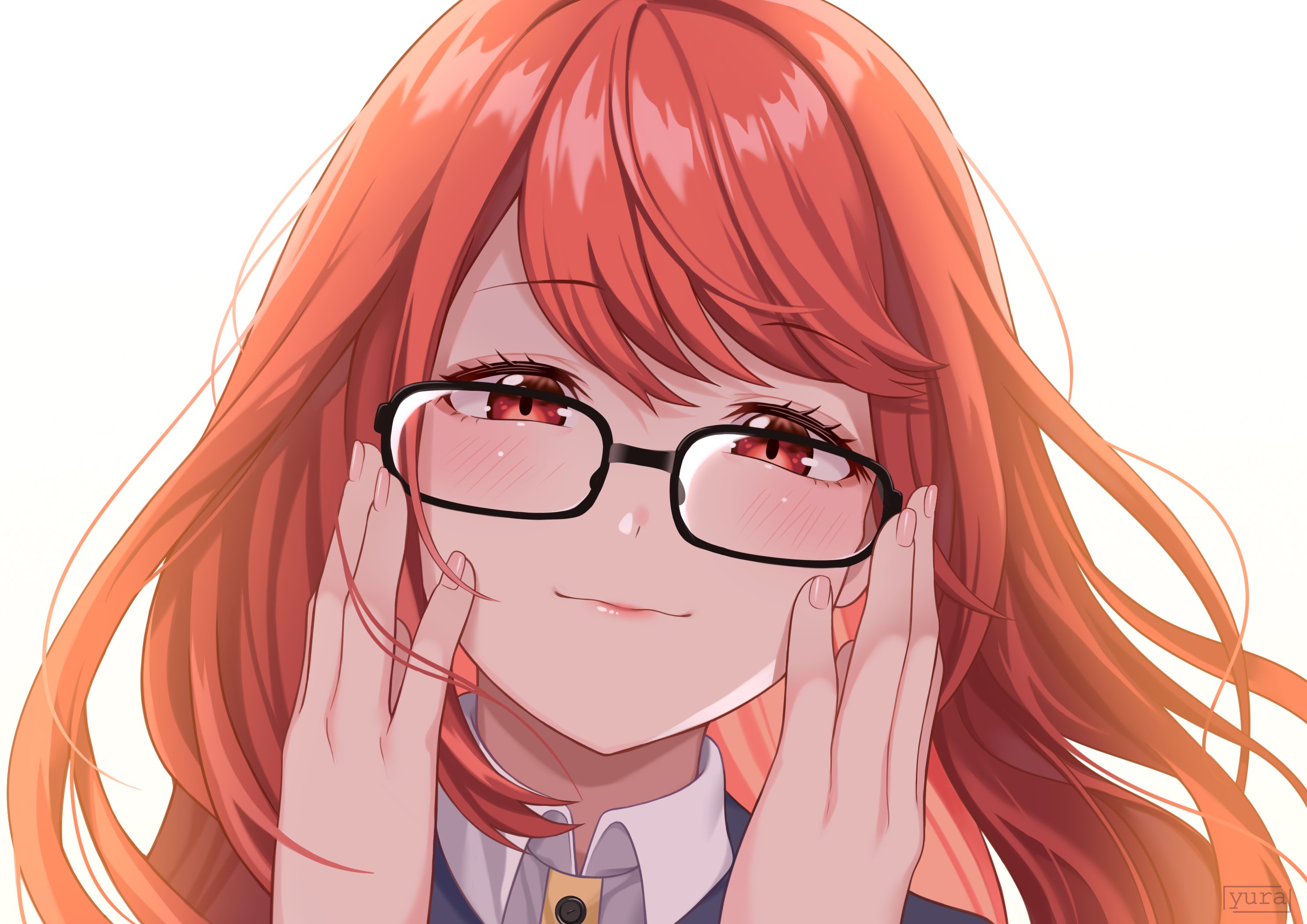 1girl black-framed_eyewear blush commentary english_commentary fingernails glasses hands_on_own_face highres lips long_hair looking_at_viewer persona persona_5 persona_5_the_royal pink_lips red_eyes red_hair simple_background smile solo upper_body white_background yoshizawa_sumire yura_s_arts