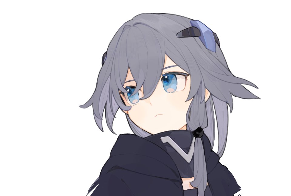 1girl black_hair black_jacket black_leotard blue_eyes closed_mouth fu_hua fu_hua_(shadow_knight) hair_between_eyes hair_ornament honkai_(series) honkai_impact_3rd jacket leotard long_hair mogomaco simple_background solo upper_body white_background