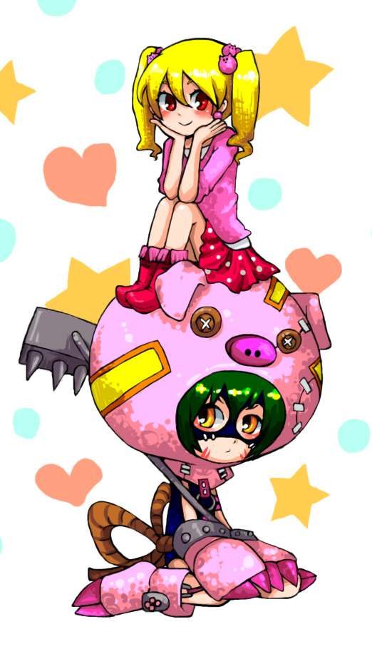2girls cho-hakkaimon digimon digimon_xros_wars digimon_xros_wars:_toki_wo_kakeru_shounen_hunter-tachi hammer long_hair looking_at_viewer mask multiple_girls one-piece_swimsuit pig short_hair smile suzaki_airu swimsuit twintails