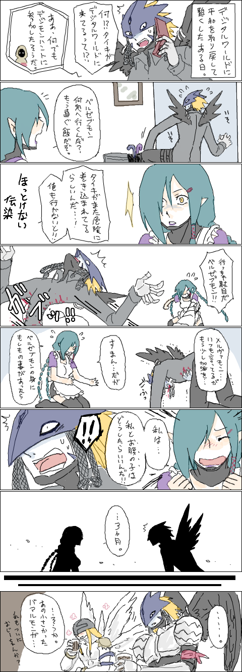 angemon apron beelzebumon_(digimon_xros_wars) cellphone digimon highres mask mervamon phone snake translation_request umbrella wings wisemon