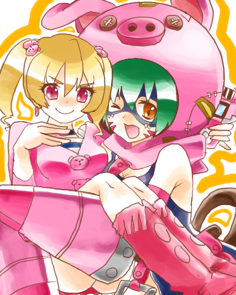 2girls blonde_hair breasts cho-hakkaimon costume digimon digimon_xros_wars digimon_xros_wars:_toki_wo_kakeru_shounen_hunter-tachi hug long_hair looking_at_viewer mask multiple_girls pig suzaki_airu twintails