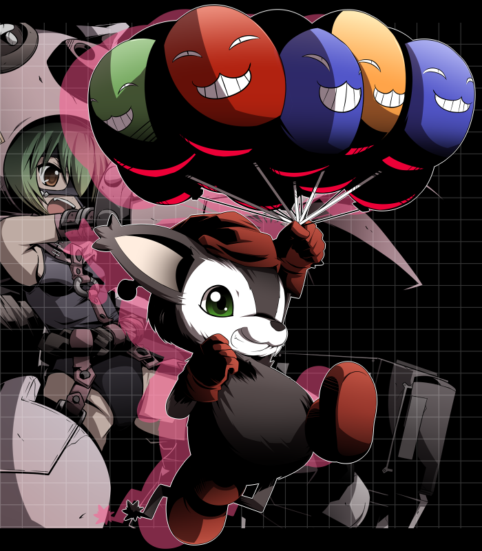 1girl balloon cho-hakkaimon digimon digimon_xros_wars digimon_xros_wars:_toki_wo_kakeru_shounen_hunter-tachi evolution gloves green_eyes mask mori_no_kaeru one-piece_swimsuit opossummon solo swimsuit