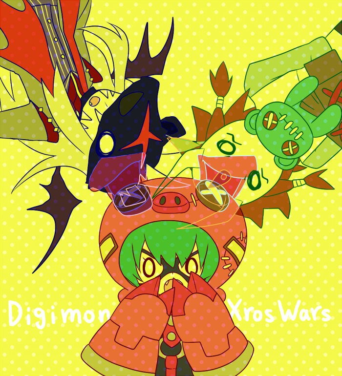 1girl 2boys astamon cho-hakkaimon costume digimon green_hair mask multiple_boys pig yaksamon